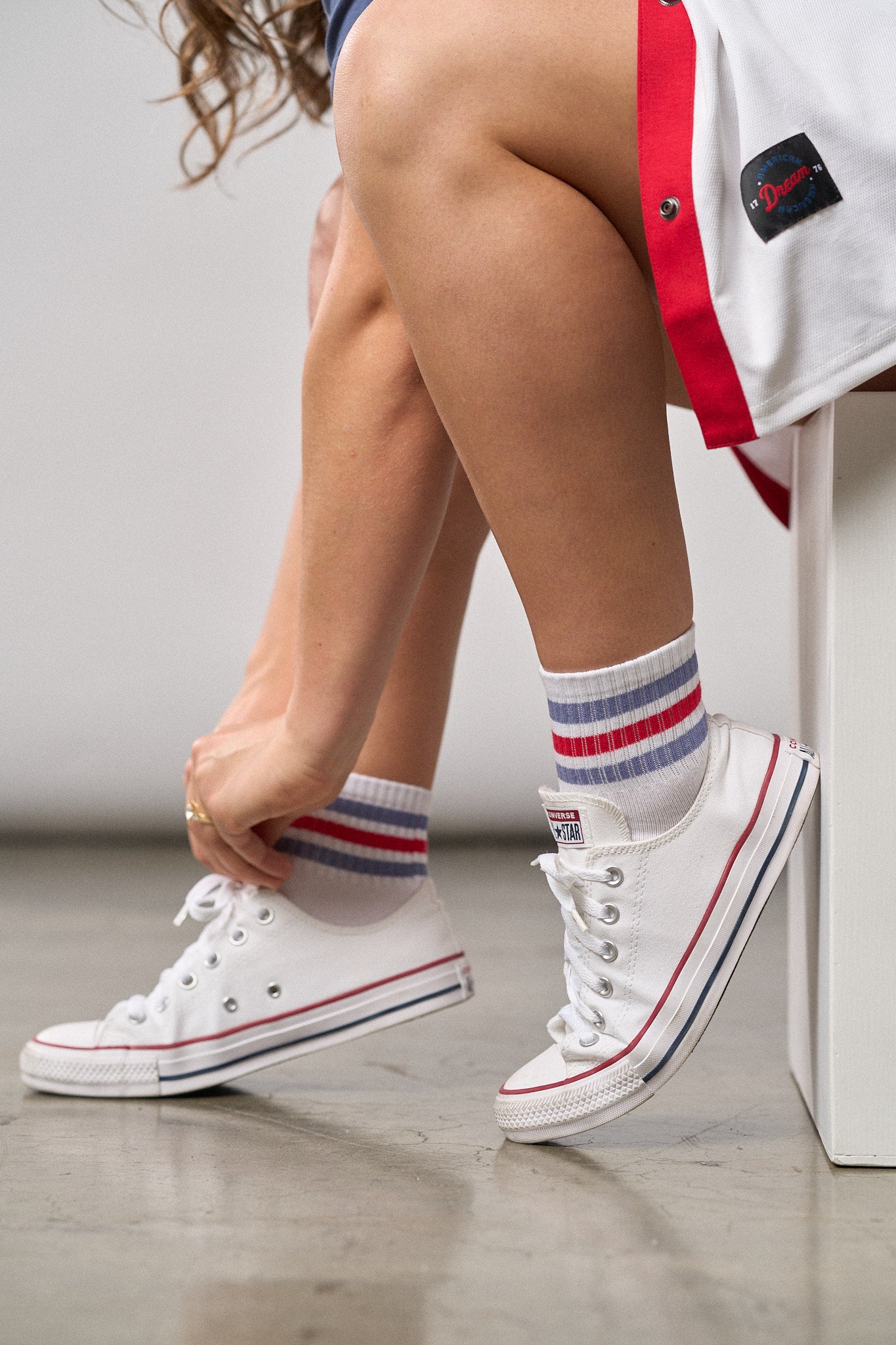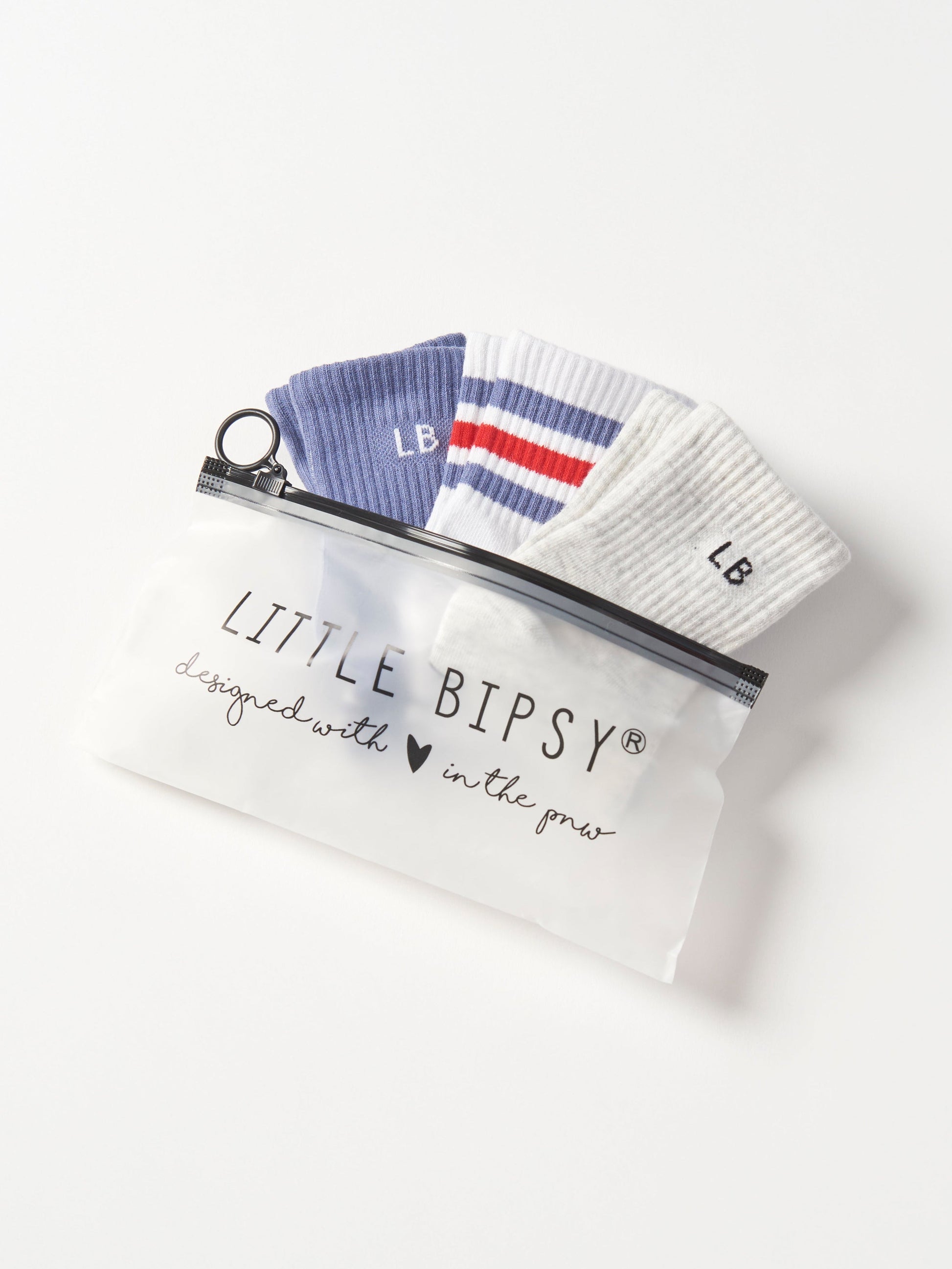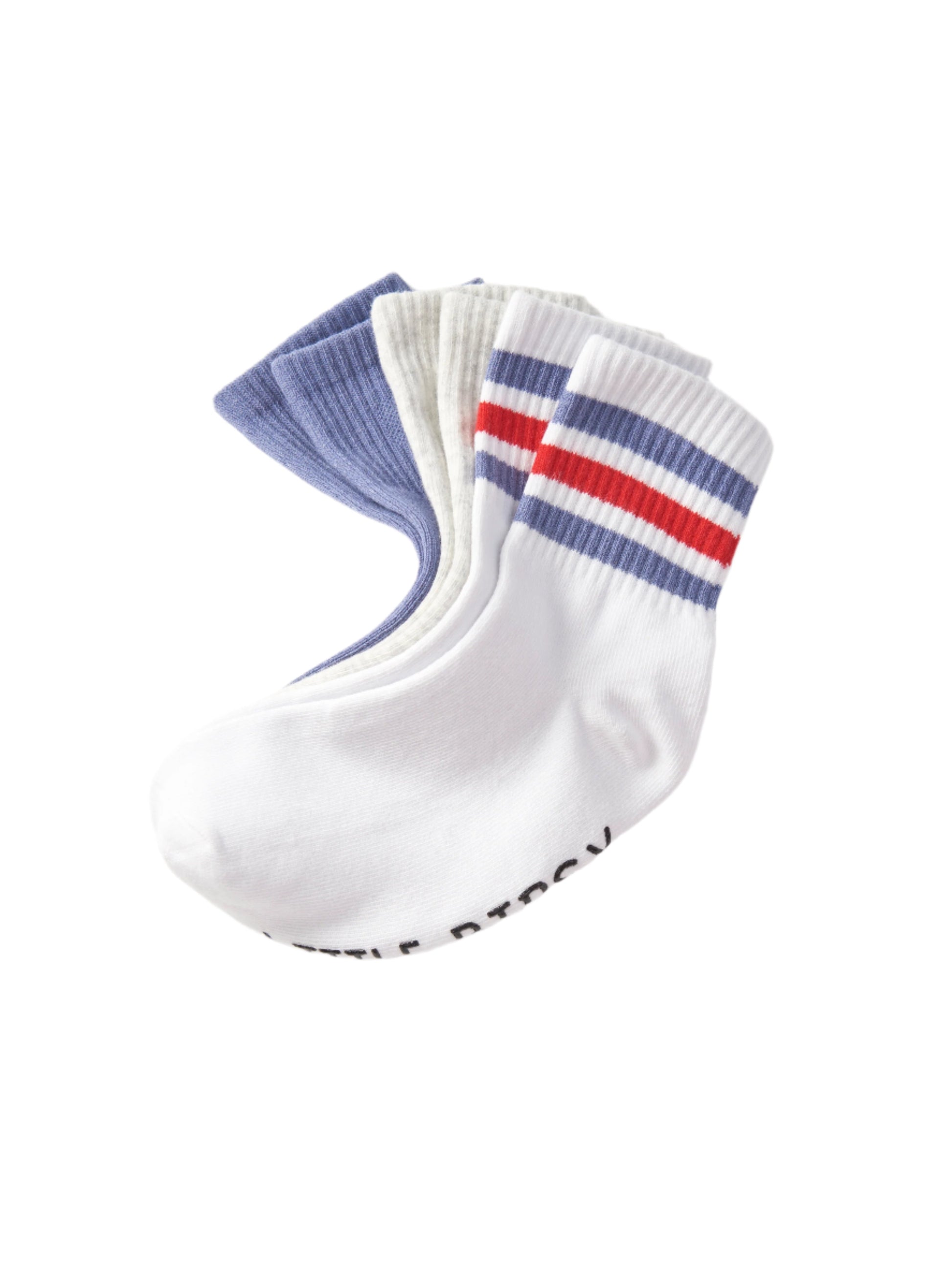 Step up your outfit with this 3-pack of USA-themed socks! In navy, grey, and white with bold red and blue stripes, these socks are perfect for all patriots. A must-have for showing off some USA pride from head to toe!
