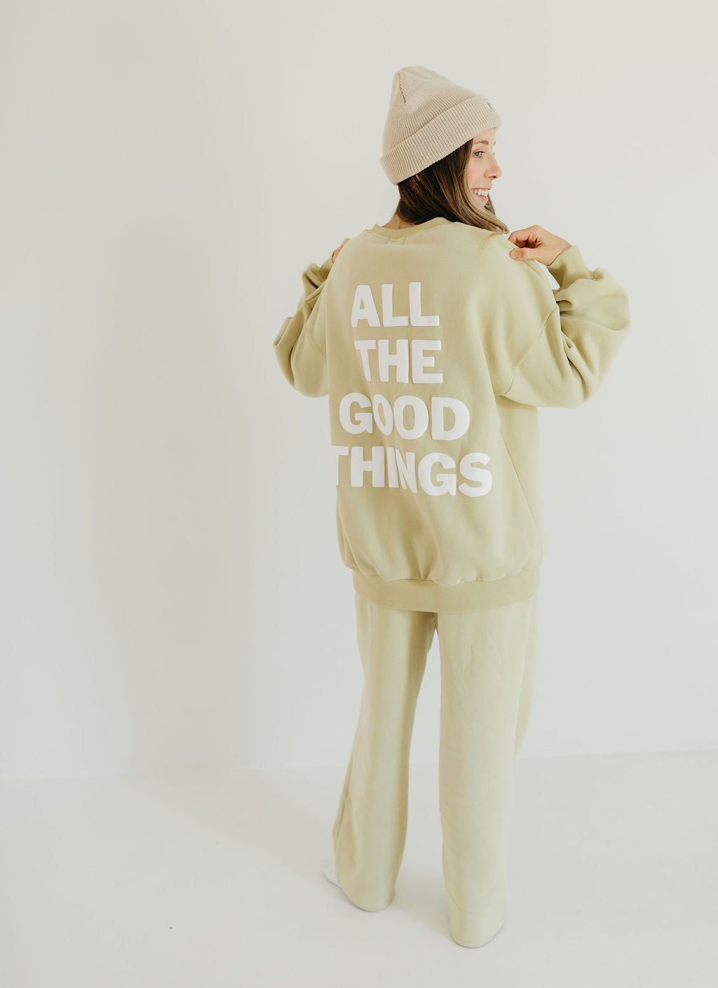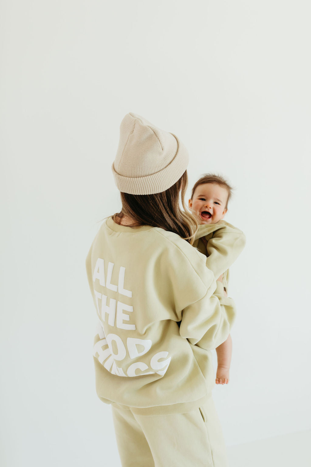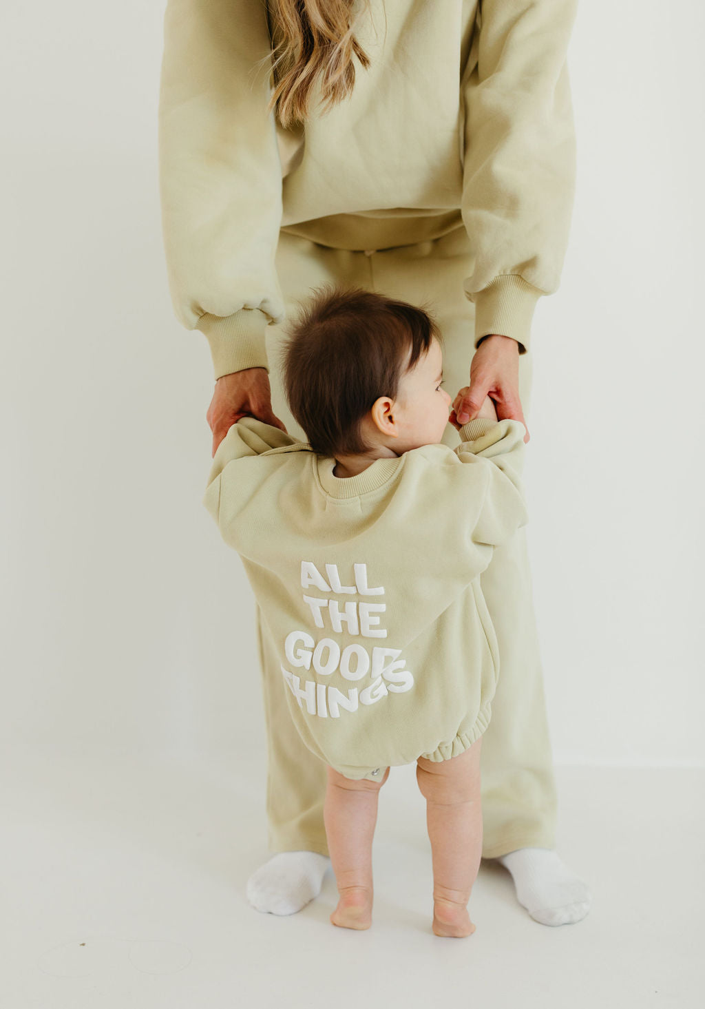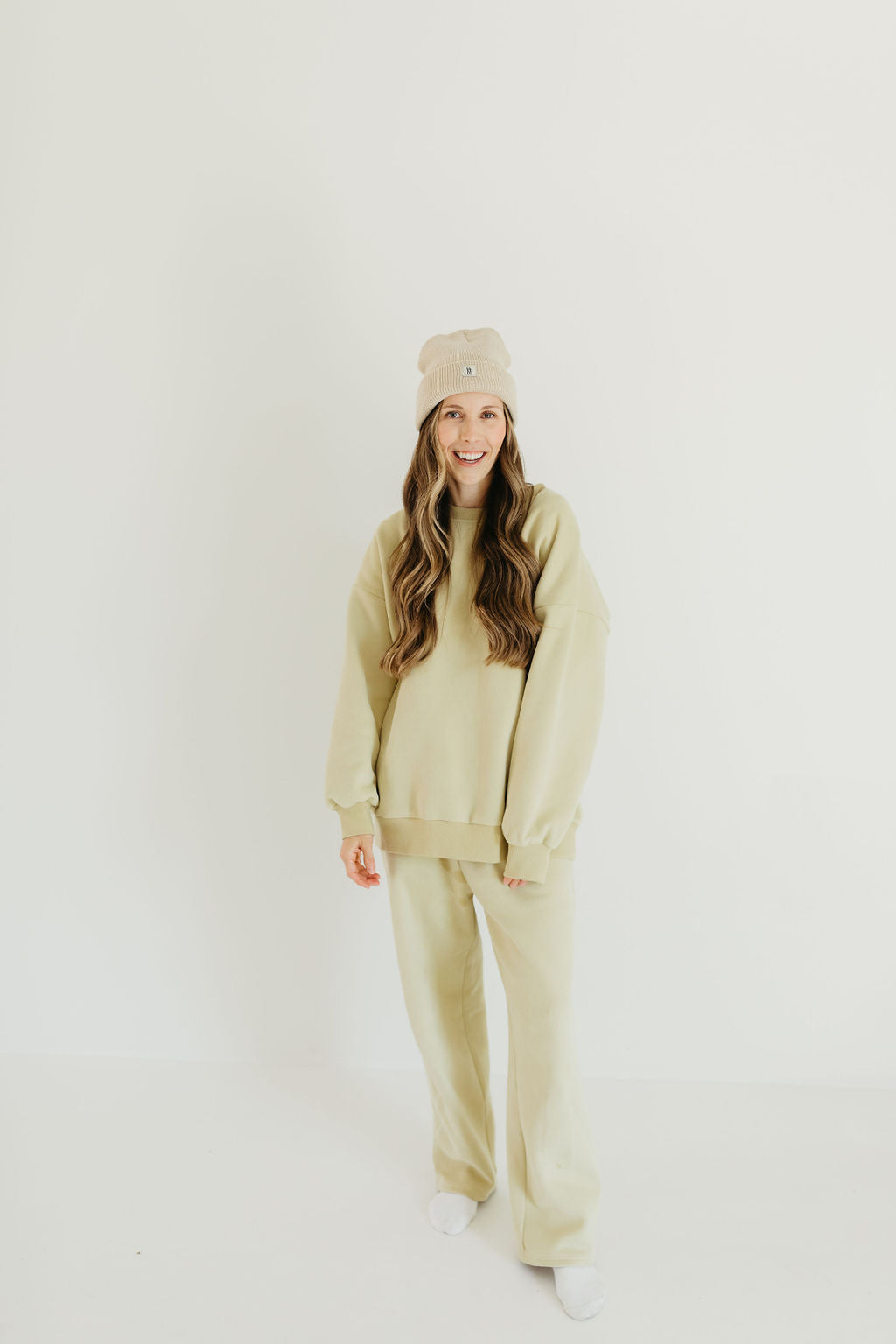 This cozy sweat set includes a sweatshirt and sweatpants in a muted avocado green. The puff lettering adds a cool touch to the laid-back design. Perfect for lounging or casual outings, you're sure to love this set.