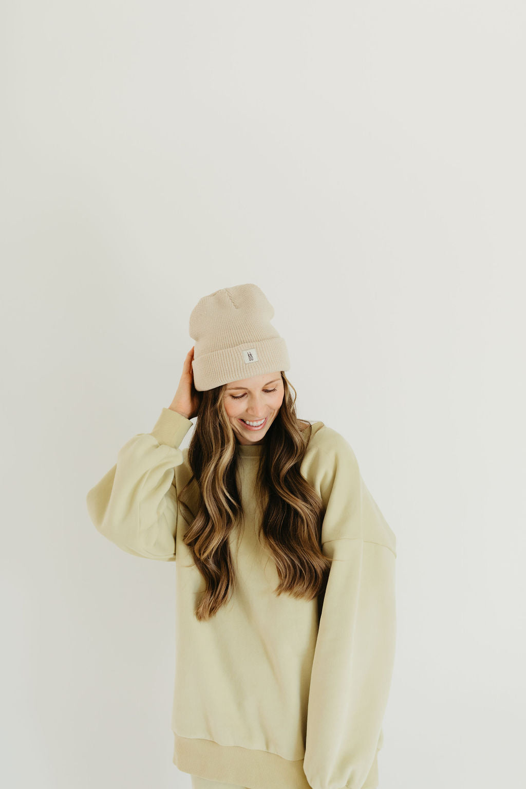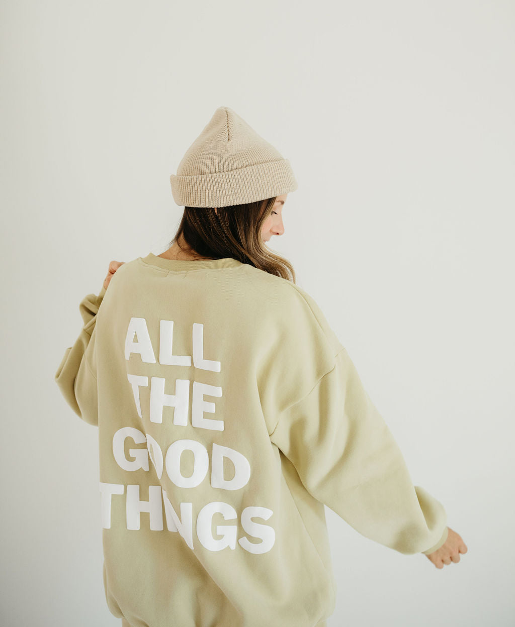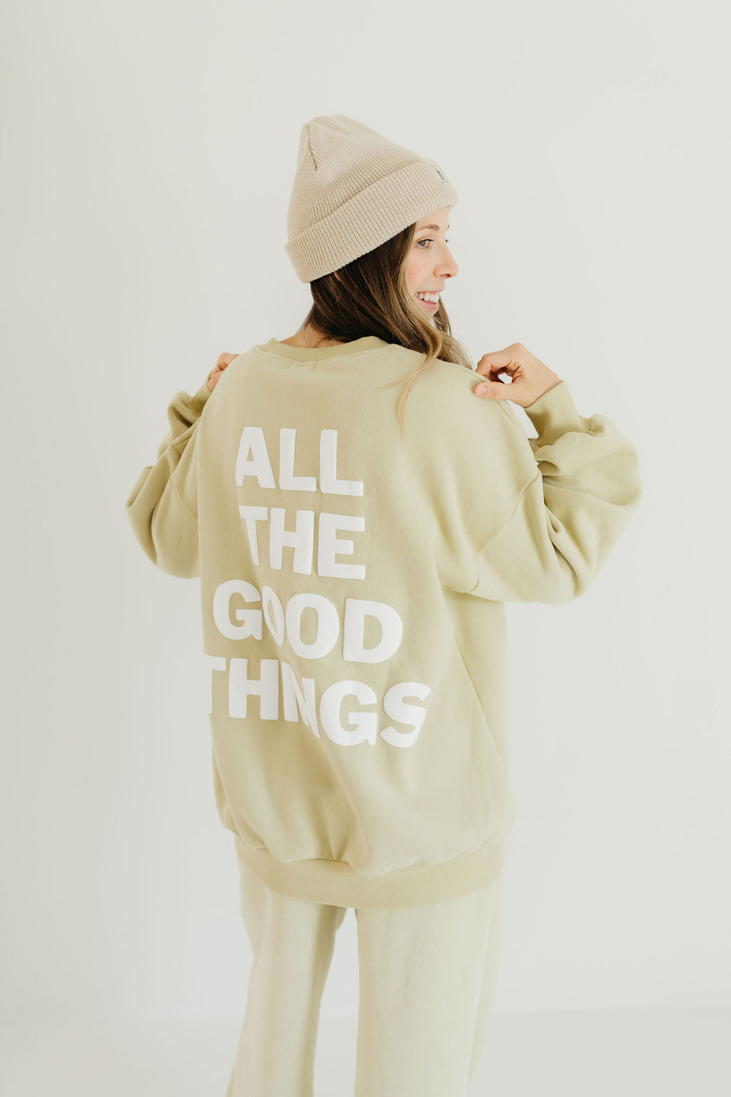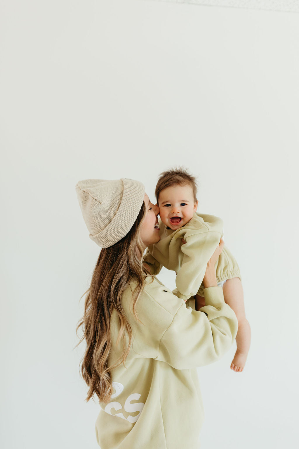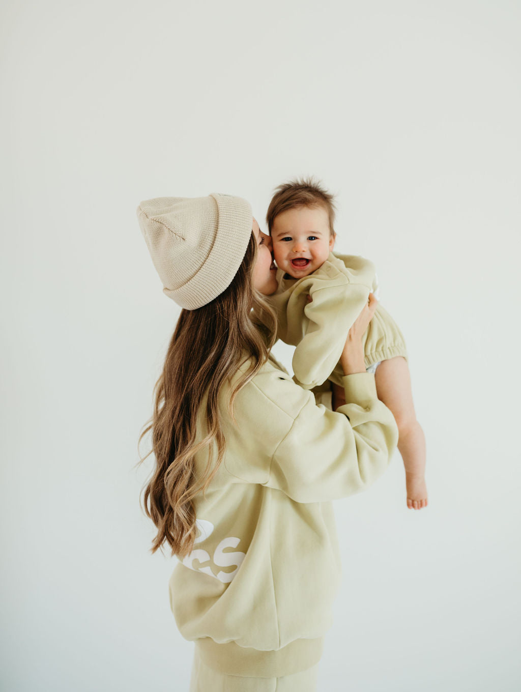 This cozy sweat set includes a sweatshirt and sweatpants in a muted avocado green. The puff lettering adds a cool touch to the laid-back design. Perfect for lounging or casual outings, you're sure to love this set.