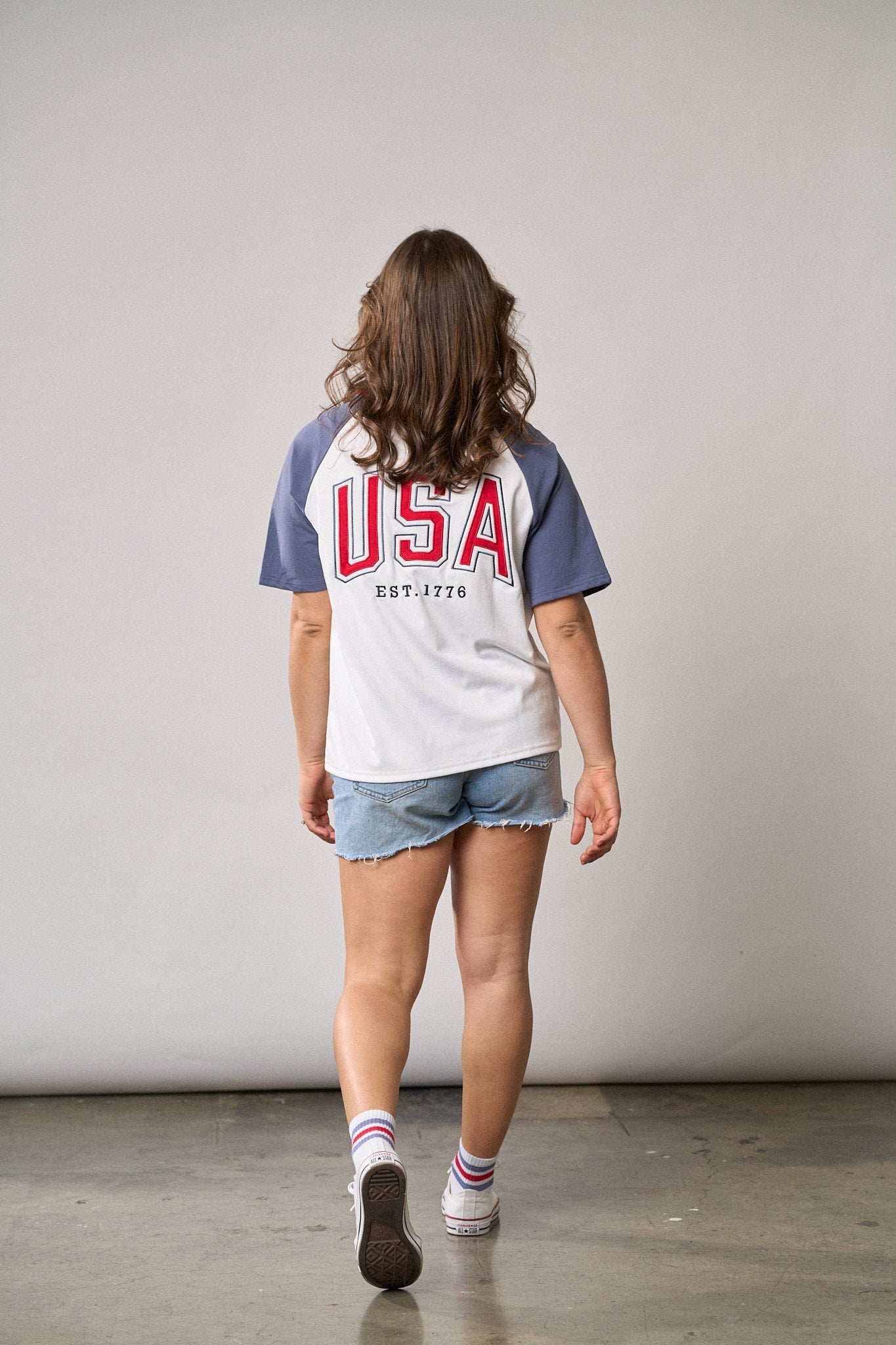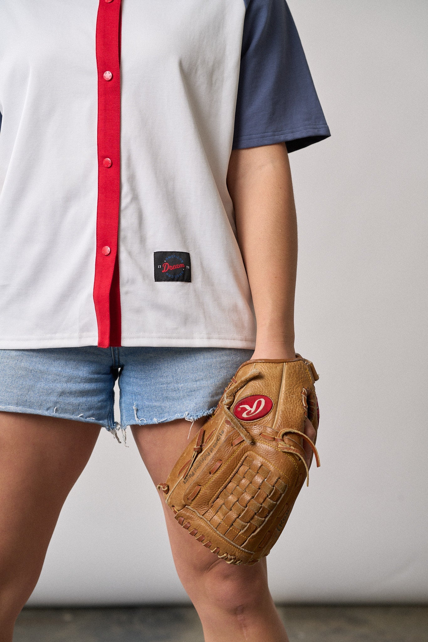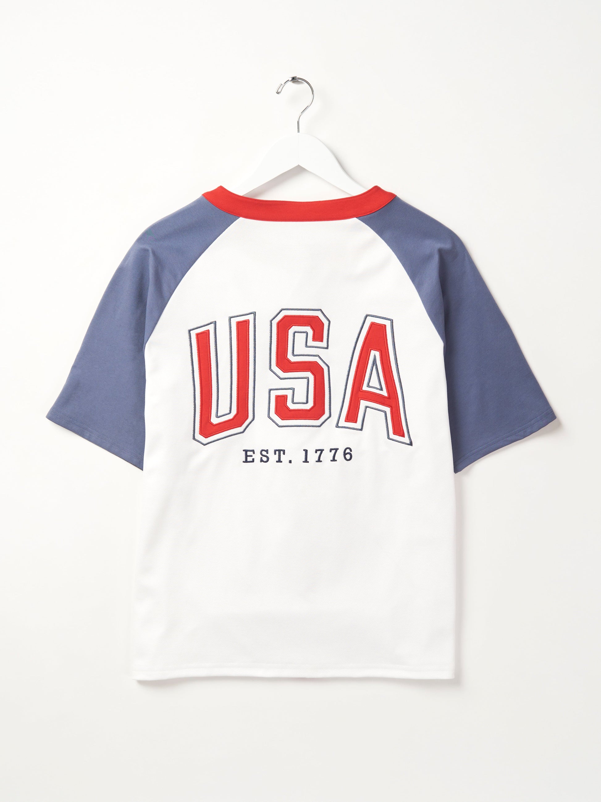 Rep the USA in style! This white jersey with red and blue accents features an embroidered "USA" on the back and a cool “American Dream” tag. This jersey is a perfect piece to elevate your outfit for any celebration or a day at the fields.
