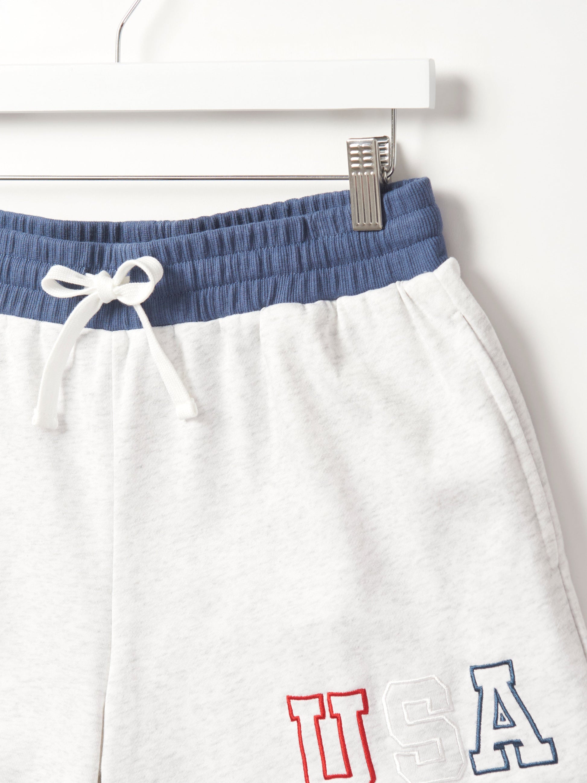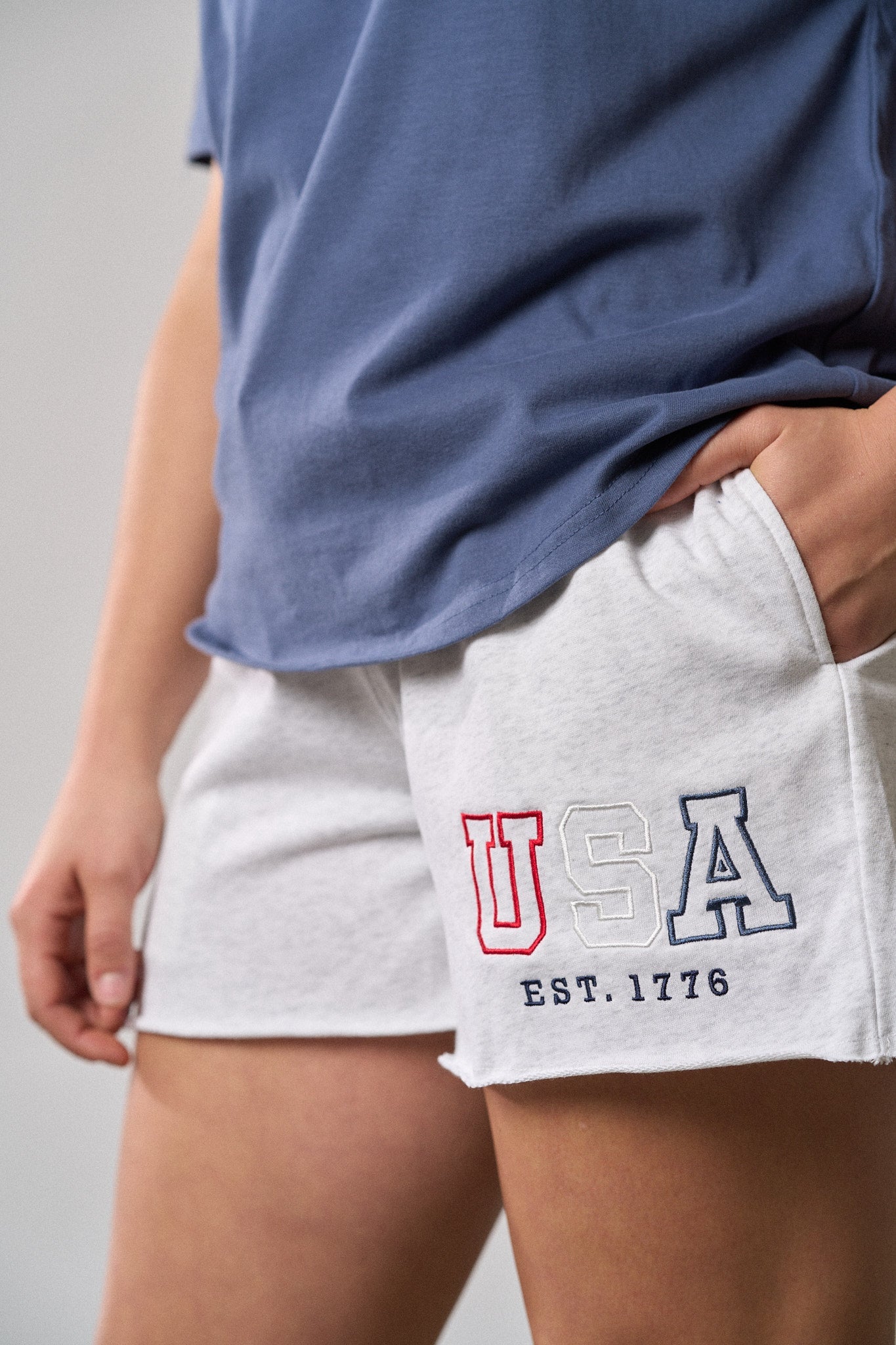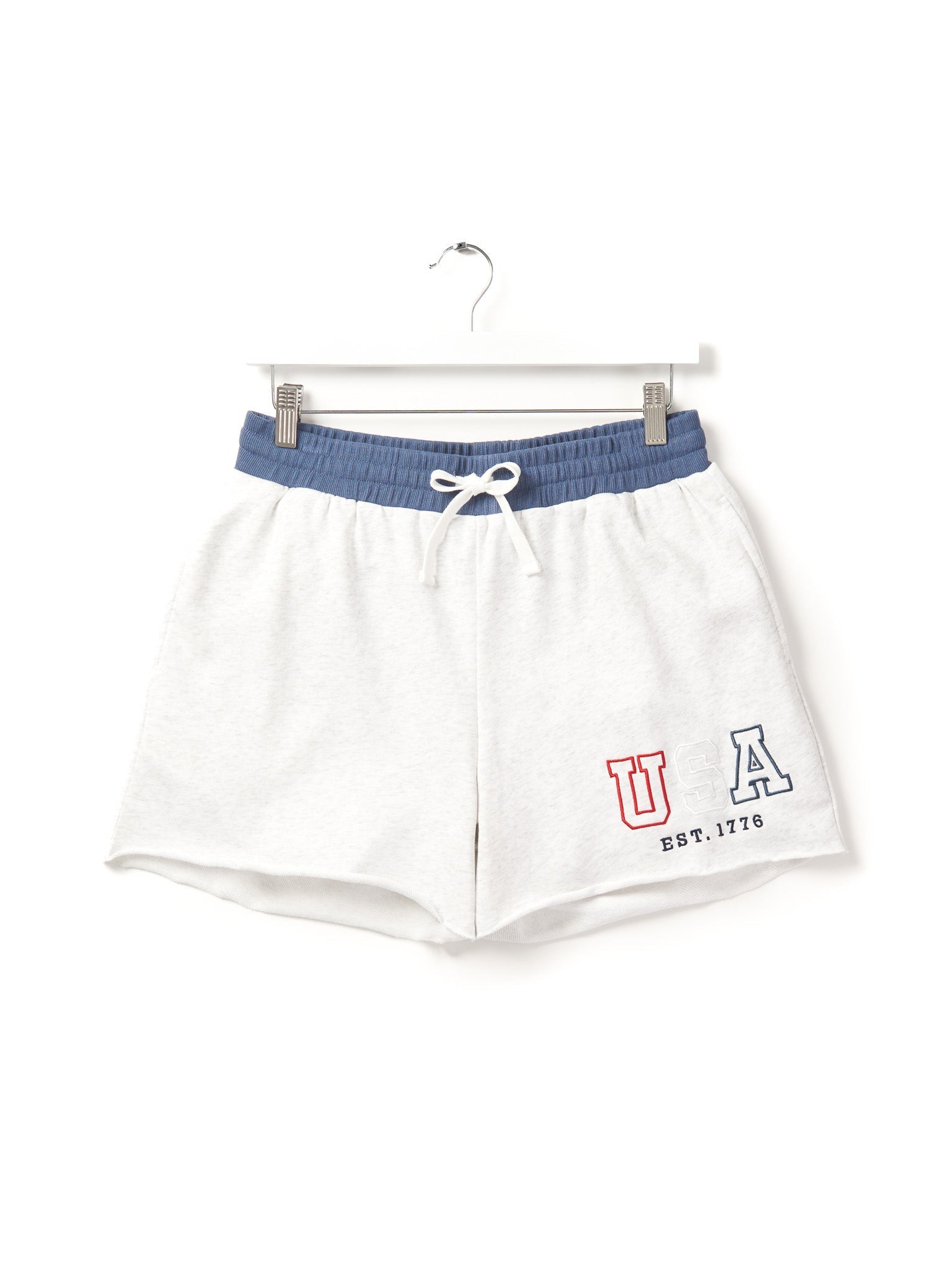 Stay comfy and stylish in these heather grey sweat shorts with a cool navy waistband! Featuring a rollable elastic waistband and a functional drawstring for the perfect fit, these shorts are all about comfort. With two front pockets, one back pocket, and an embroidered "USA" design, they're ready for any laid-back, patriotic day.