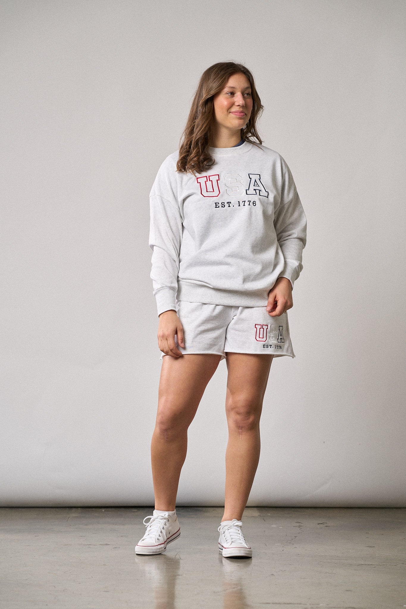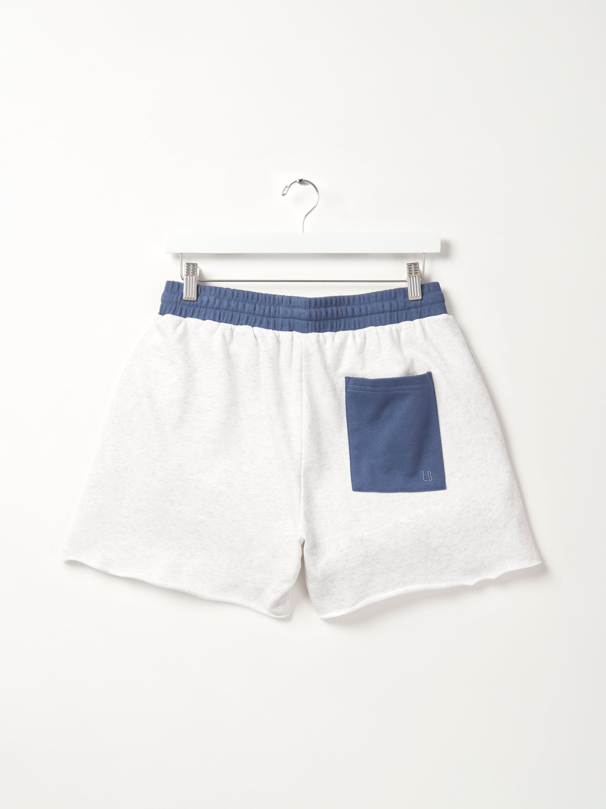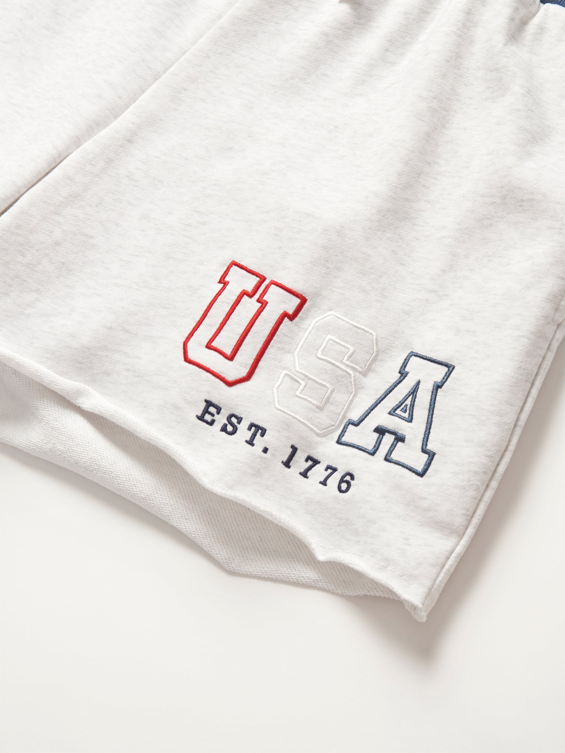 Stay comfy and stylish in these heather grey sweat shorts with a cool navy waistband! Featuring a rollable elastic waistband and a functional drawstring for the perfect fit, these shorts are all about comfort. With two front pockets, one back pocket, and an embroidered "USA" design, they're ready for any laid-back, patriotic day.