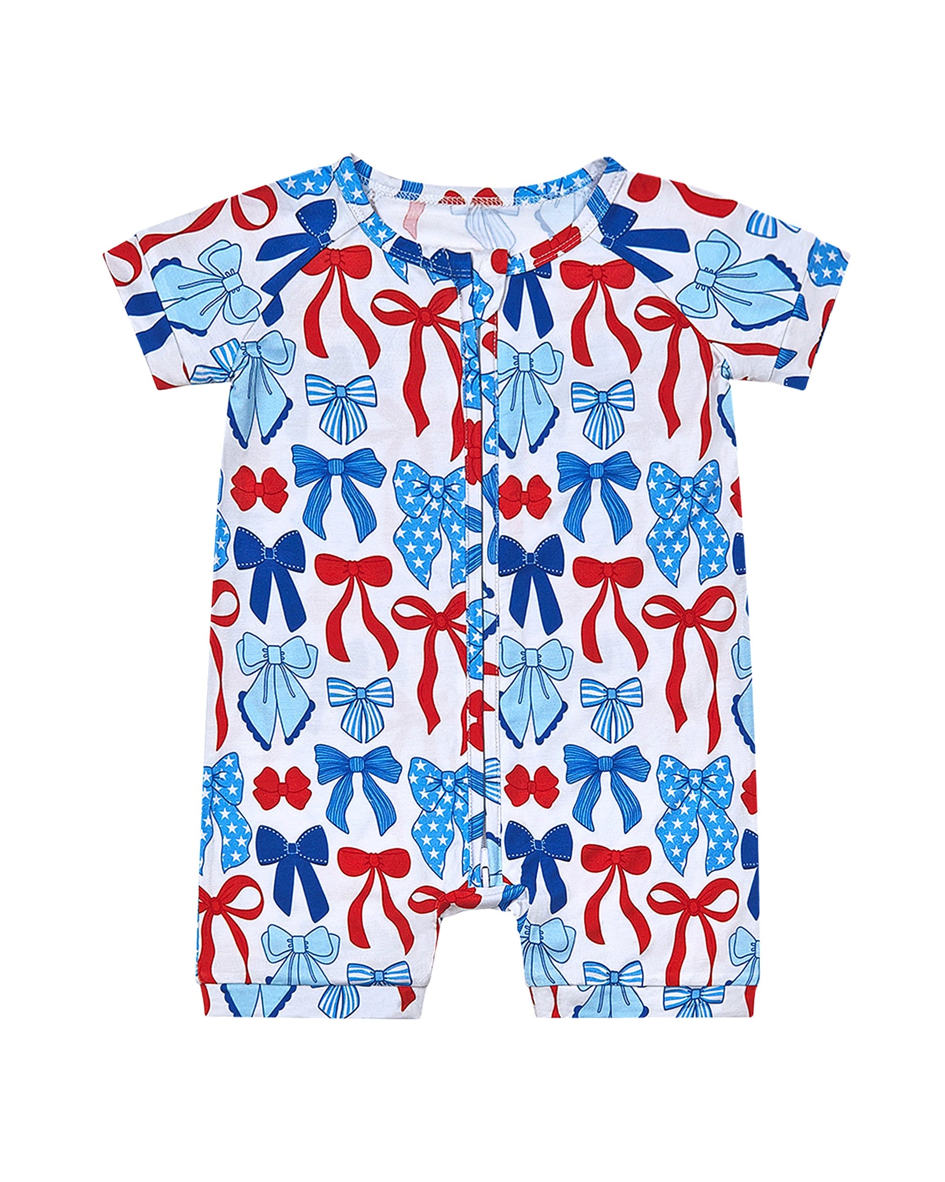 Add a pop of patriotic sweetness to your little one's summer wardrobe with the Bamboo Shorty Romper | Red-White & Bows!