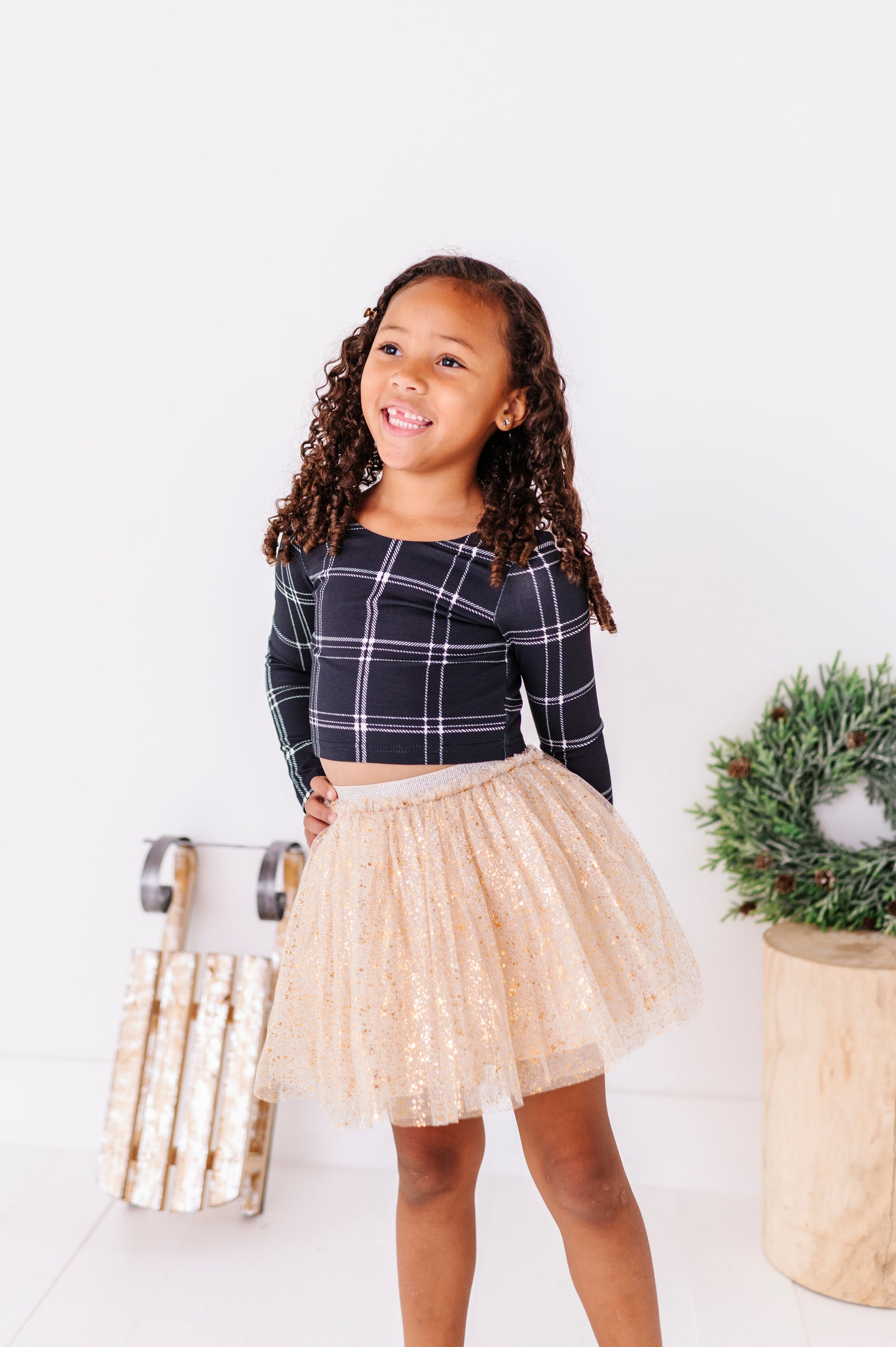 Black Plaid | CROPPED Bow Back Long Sleeve Top