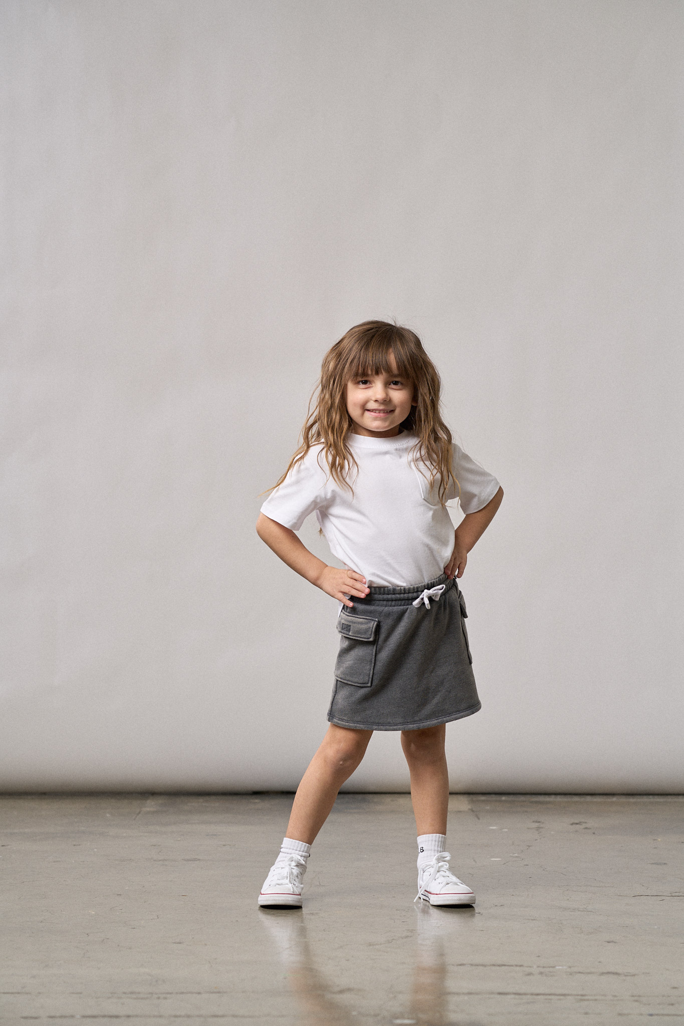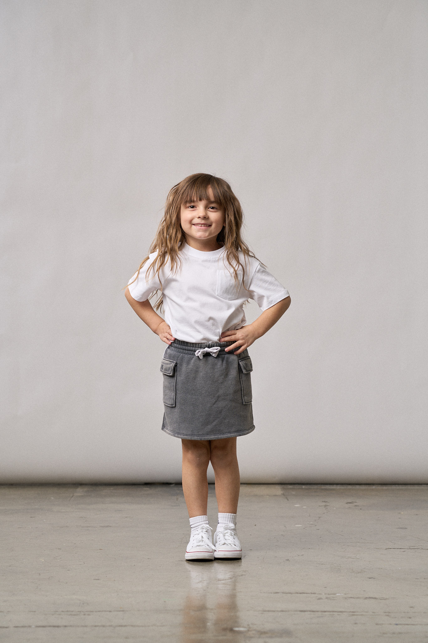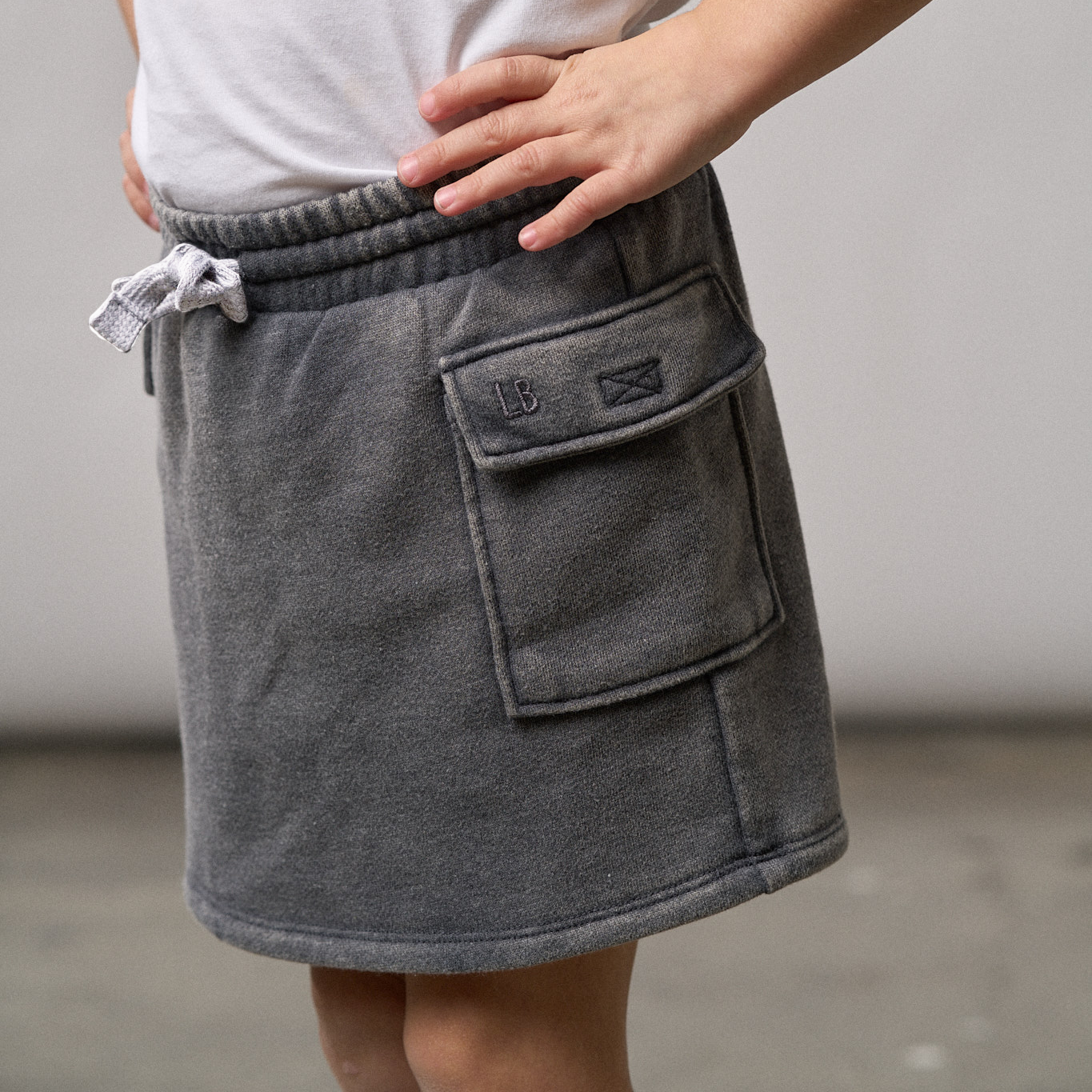 Adventure-ready and stylish, our Cargo Skort is the perfect blend of comfort and functionality. Made with a trendy charcoal wash, this skort features a ribbed elastic waistband for a secure, comfy fit, and a functional sewn-in drawstring for added adjustability. The Velcro cargo side pockets offer plenty of space for all the little essentials they need on the go.