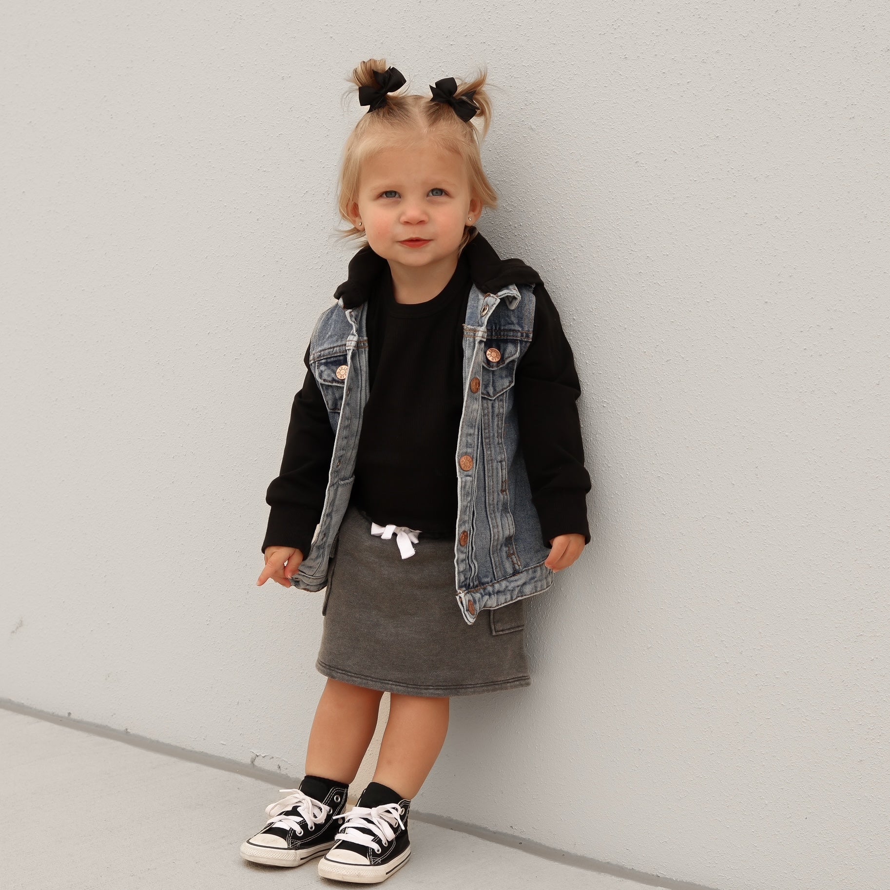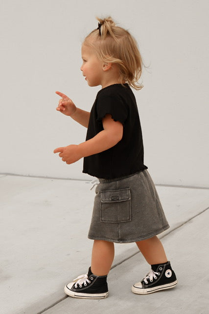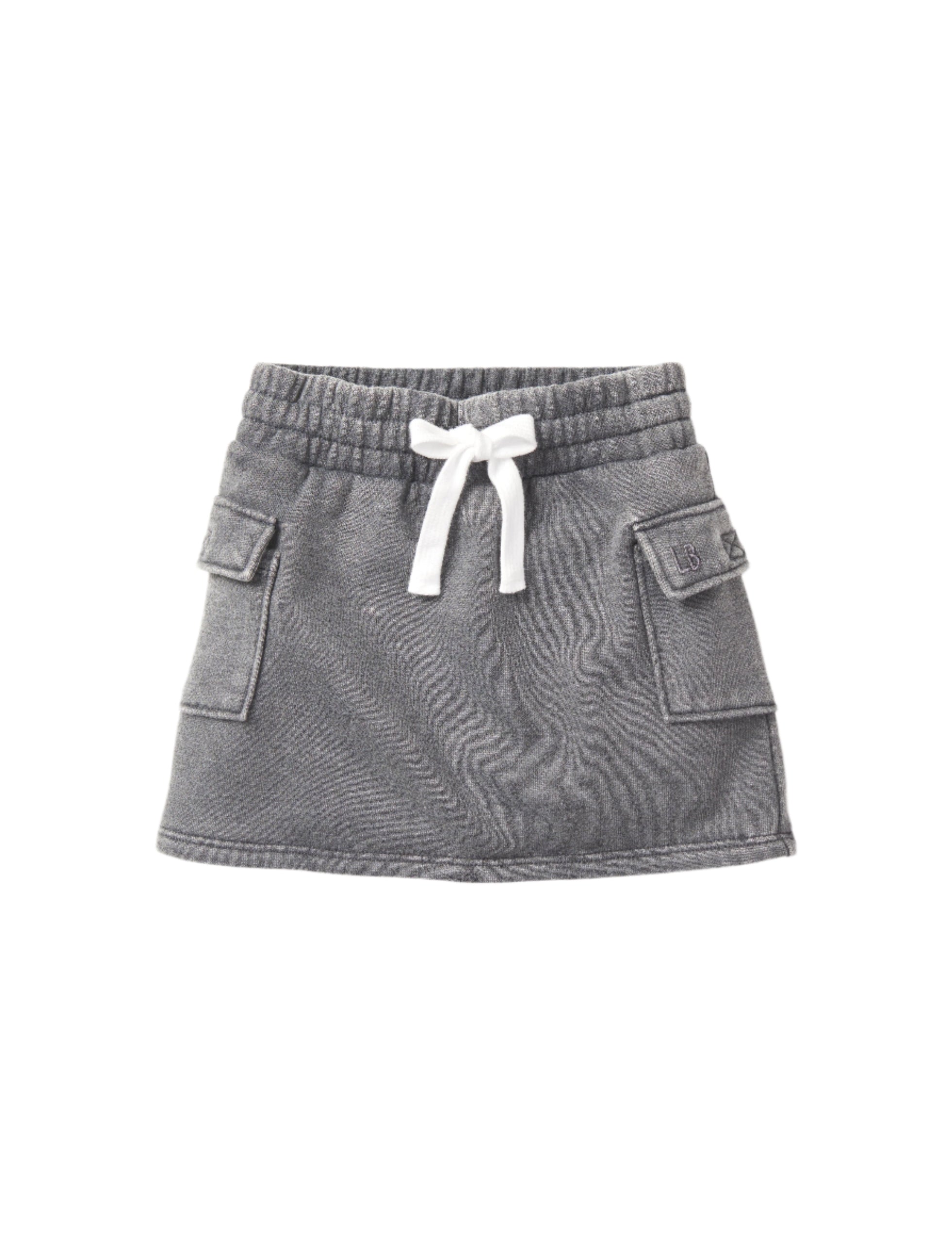 Adventure-ready and stylish, our Cargo Skort is the perfect blend of comfort and functionality. Made with a trendy charcoal wash, this skort features a ribbed elastic waistband for a secure, comfy fit, and a functional sewn-in drawstring for added adjustability. The Velcro cargo side pockets offer plenty of space for all the little essentials they need on the go.