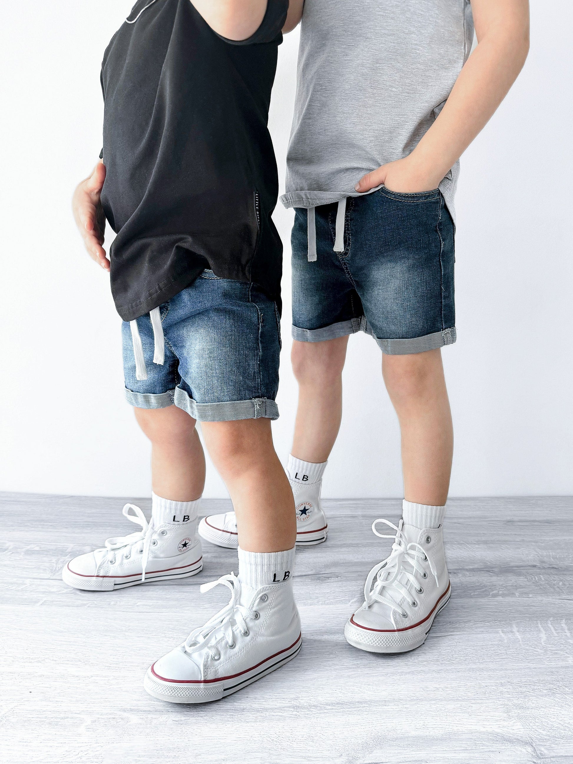 Meet your new favorite denim shorts. Our Classic Denim Shorts make any outfit look effortlessly cool. These shorts were designed with an elastic waistband + functioning drawstring for easy dressing, as well as a custom classic blue wash + rolled leg cuffs for chill warm-weather style.