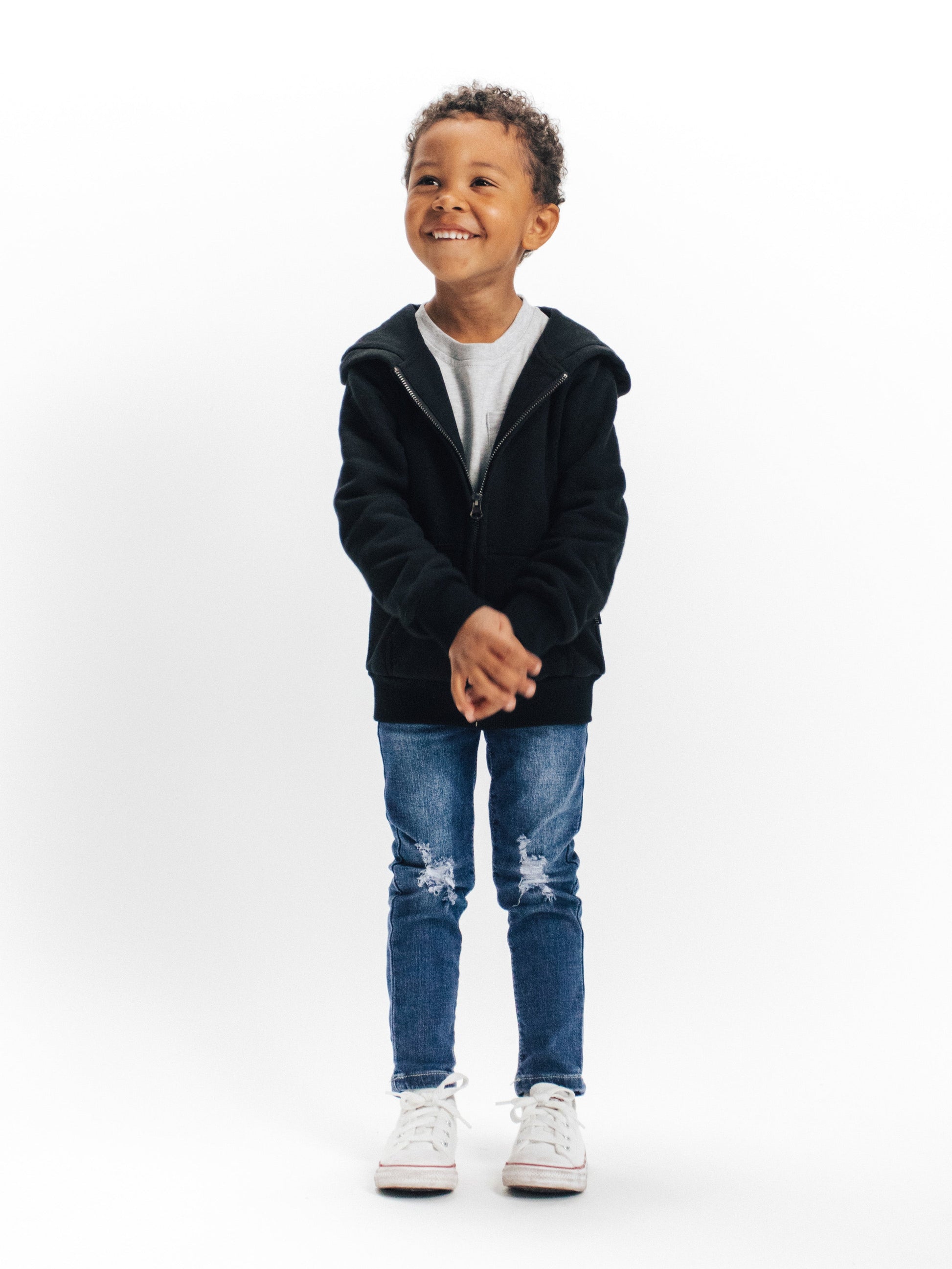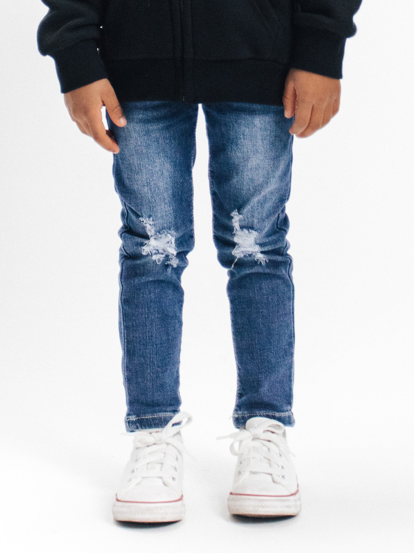 Meet your new favorite jeans. Our Distressed Denim makes any outfit look effortlessly cool. These jeans were designed with an elastic waistband + functioning drawstring for easy dressing, as well as a custom classic blue wash, stylish distressing, and a straight leg fit for all day comfort + non-restricting play.