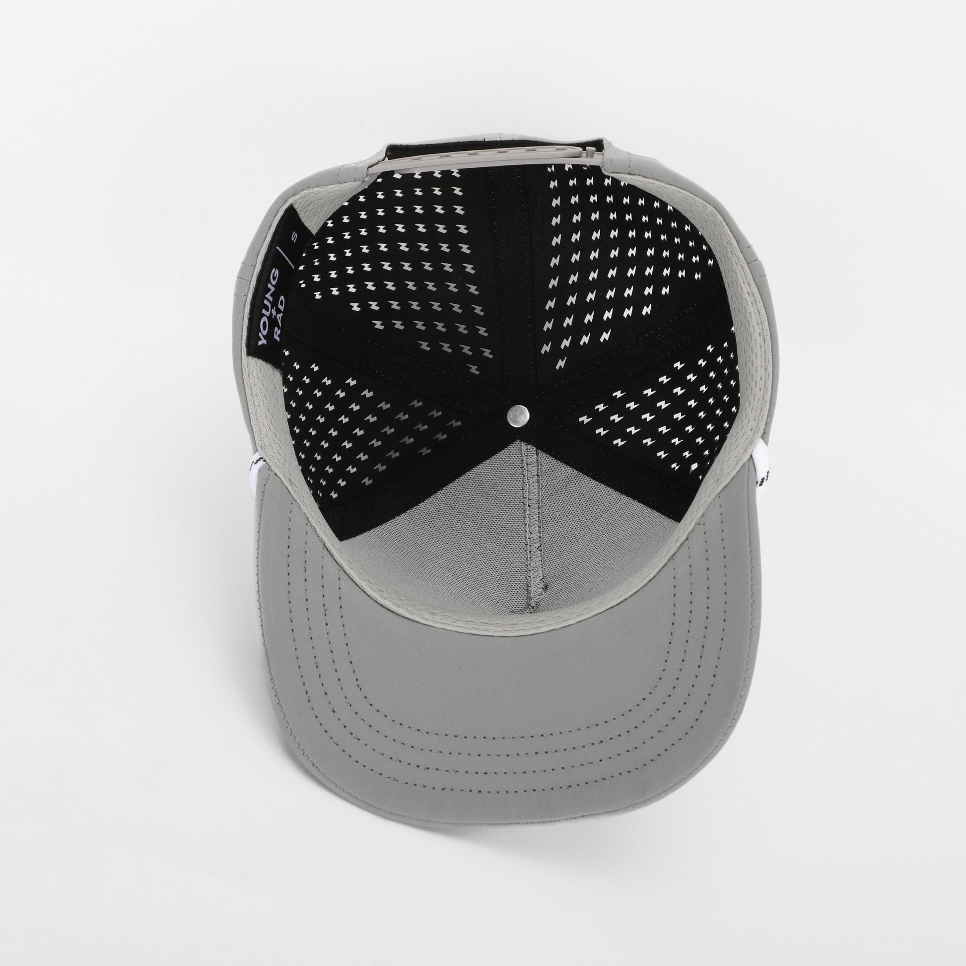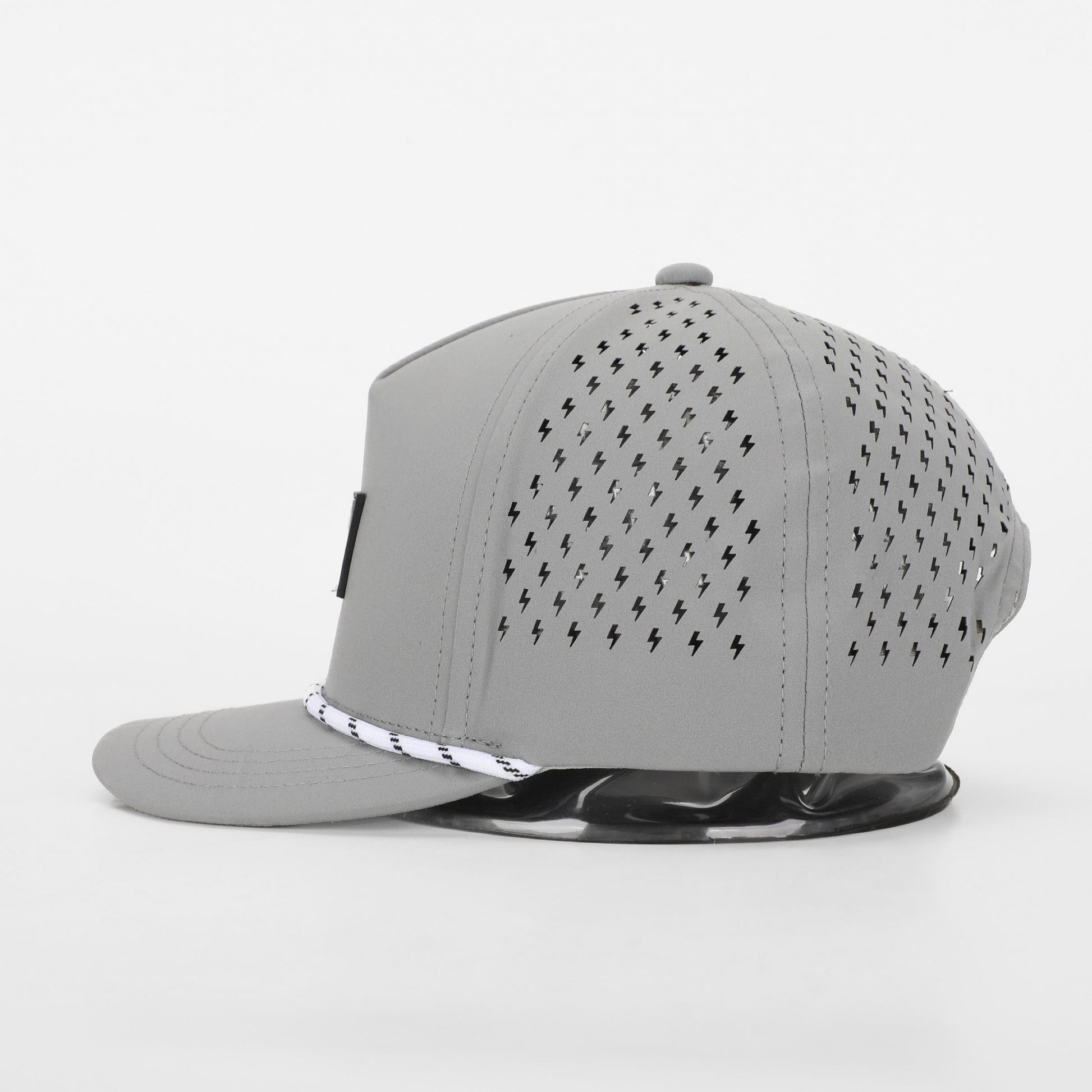 Crown: Hydrophobic coated crown panels with lightning bolt laser cut side and rear panels for all day comfort and breathability.
