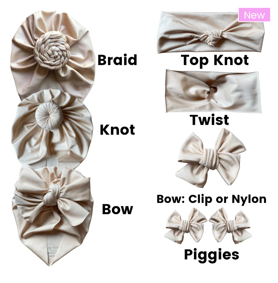 Available in a turban, headband (match your mini!), piggies, or our BRAND NEW bows!