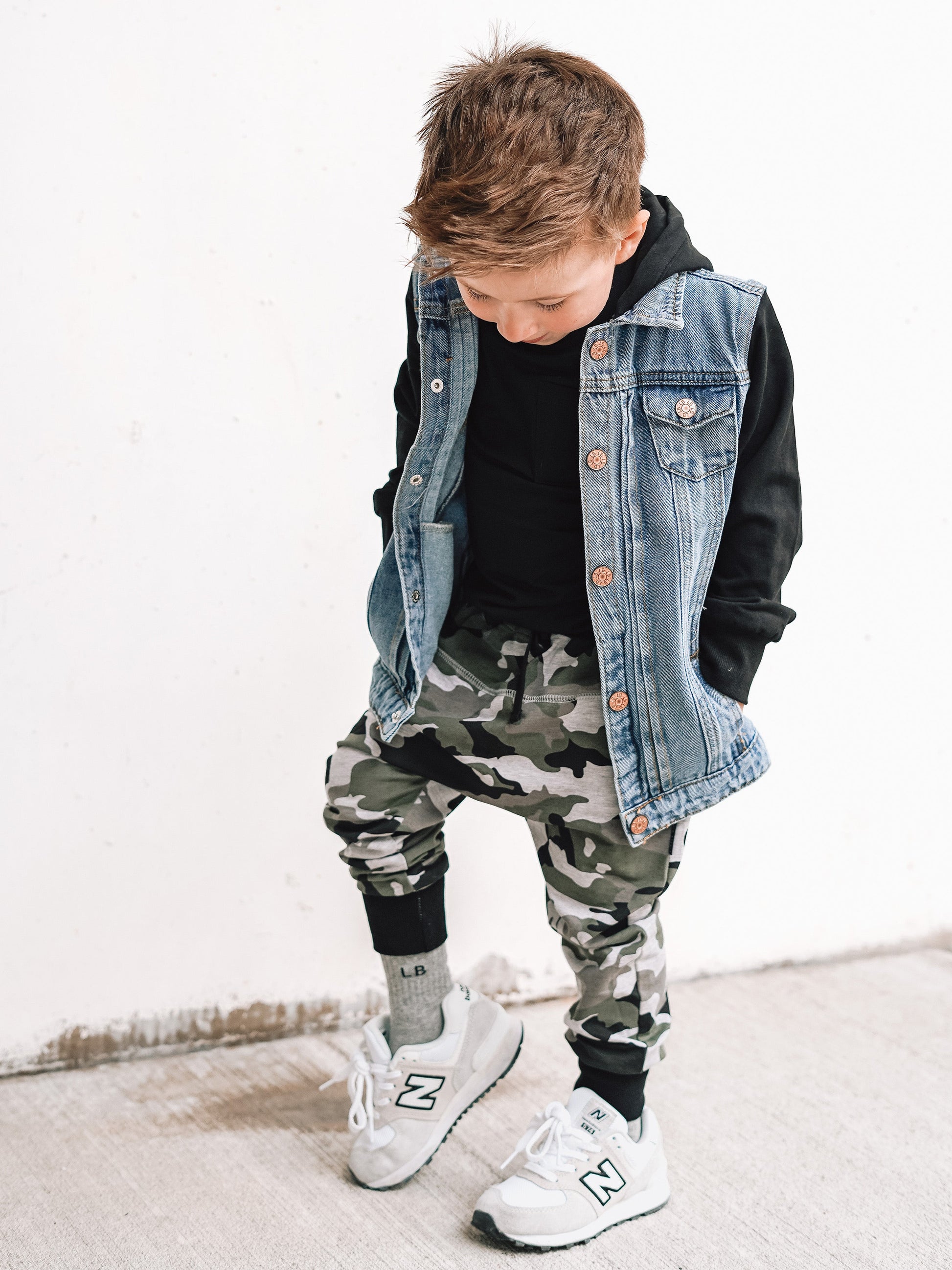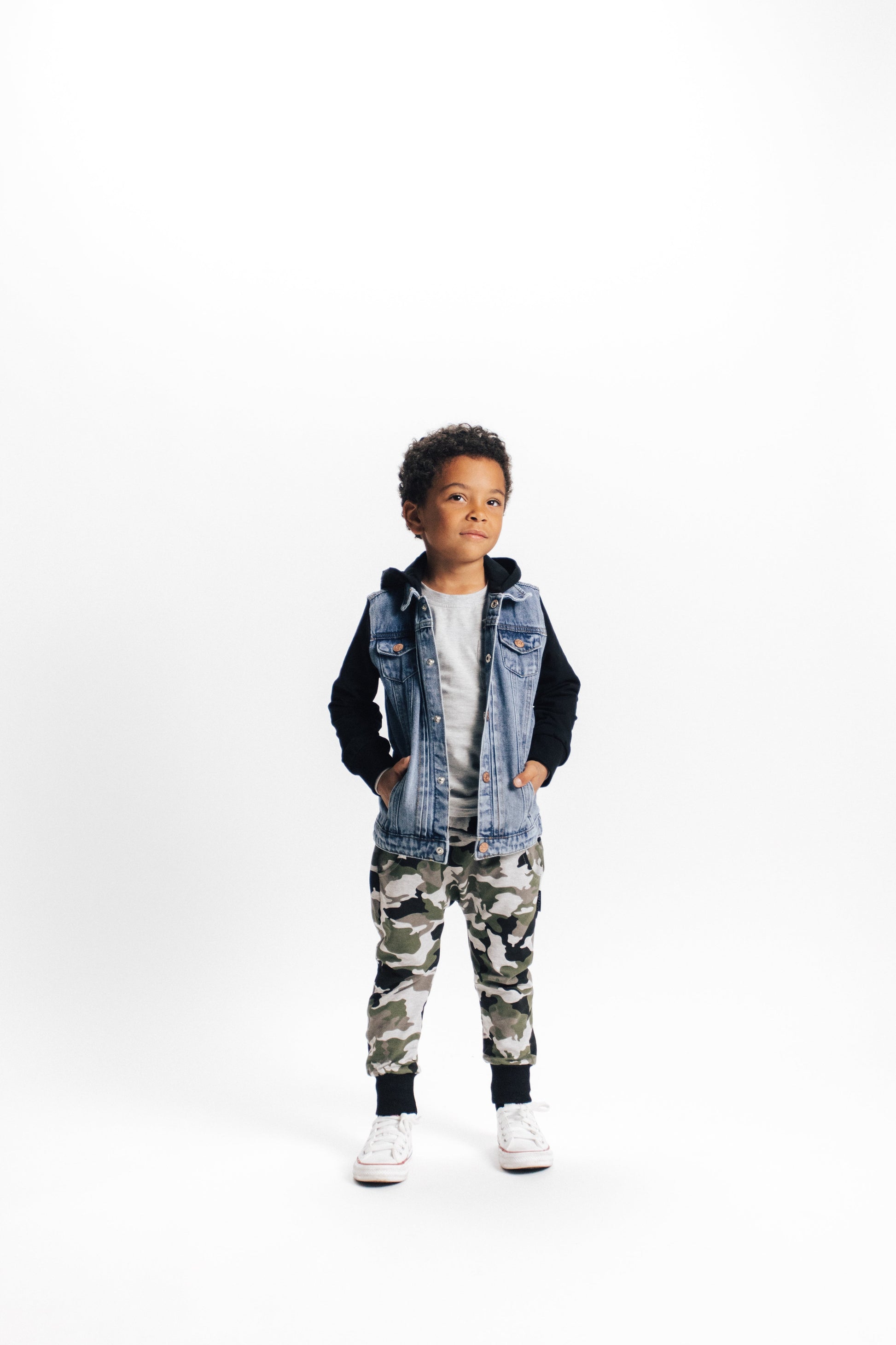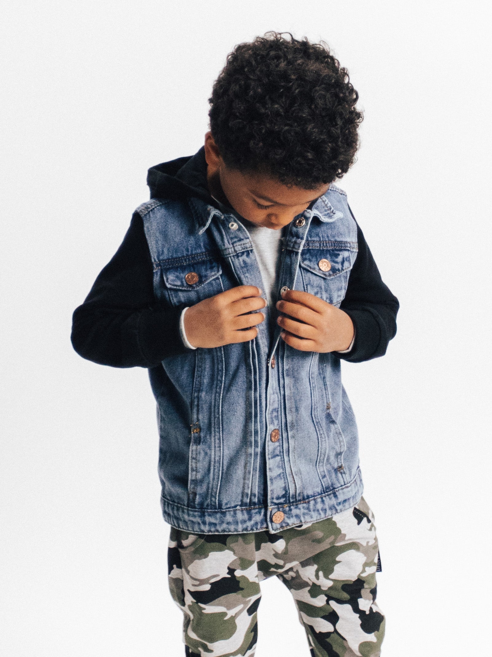 When a timeless staple is given a modern twist, you get one of our signature pieces: the Hooded Denim Jacket. The torso of our Denim Jacket is given sleeves + a hood made from our classic Core material, creating unique + versatile outerwear that’s sure to be the talk of the playground.