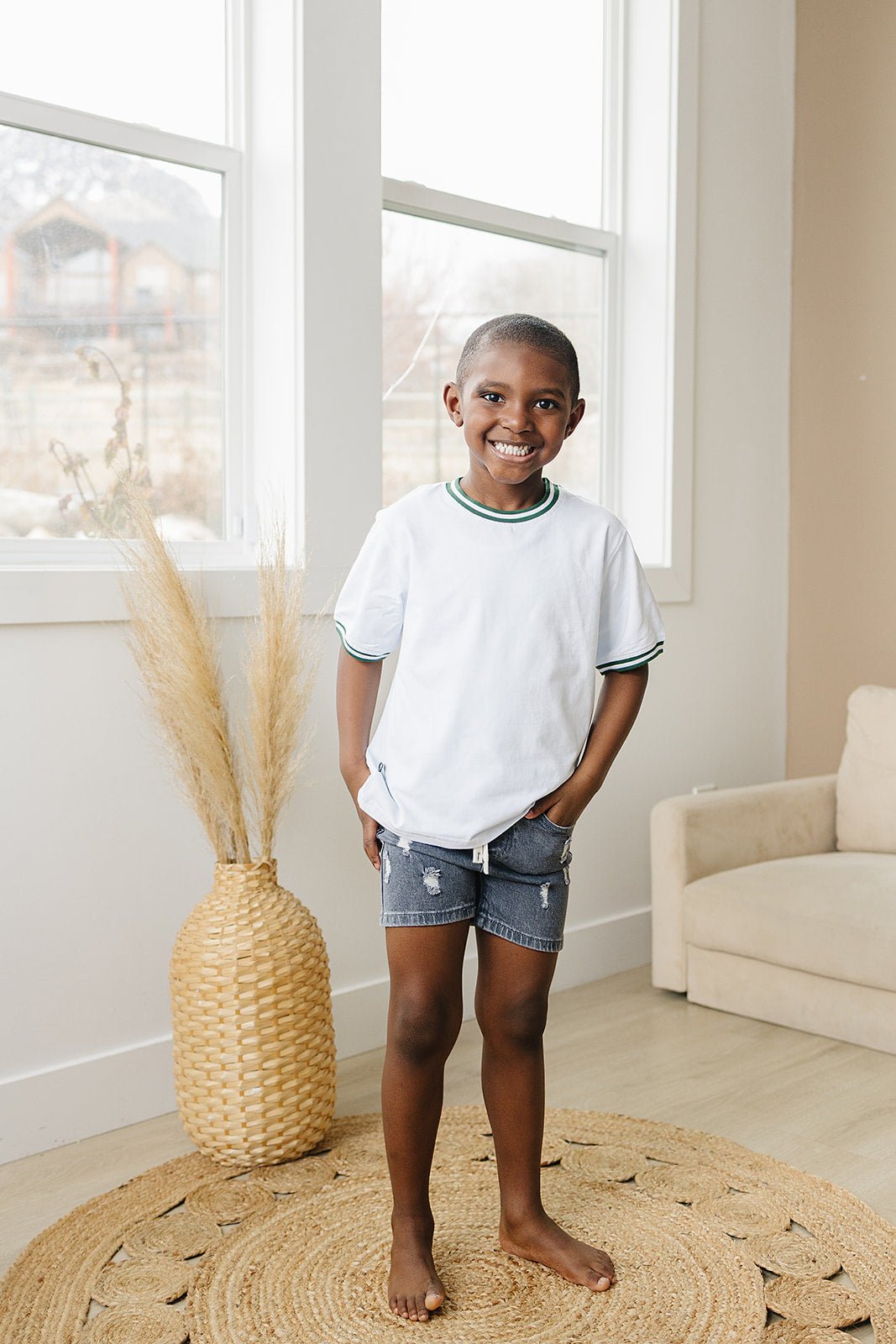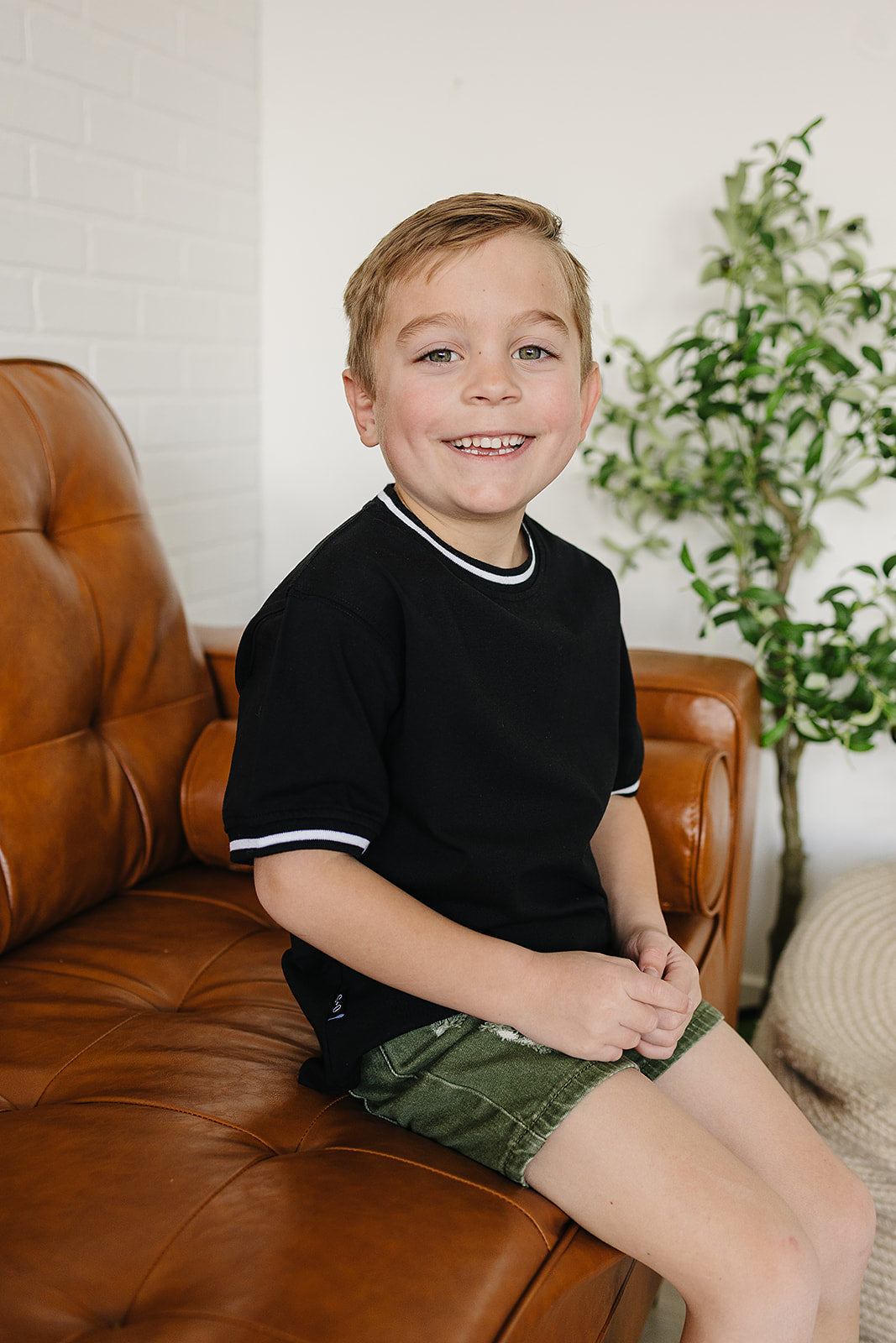 Get your little one looking effortlessly stylish and comfortable with our Hunter Tee! Featuring a banded collar and sleeves for a sophisticated touch, this tee is made with soft fabric for all-day comfort. Perfectly paired with shorts or pants, it's the ultimate addition to their wardrobe!