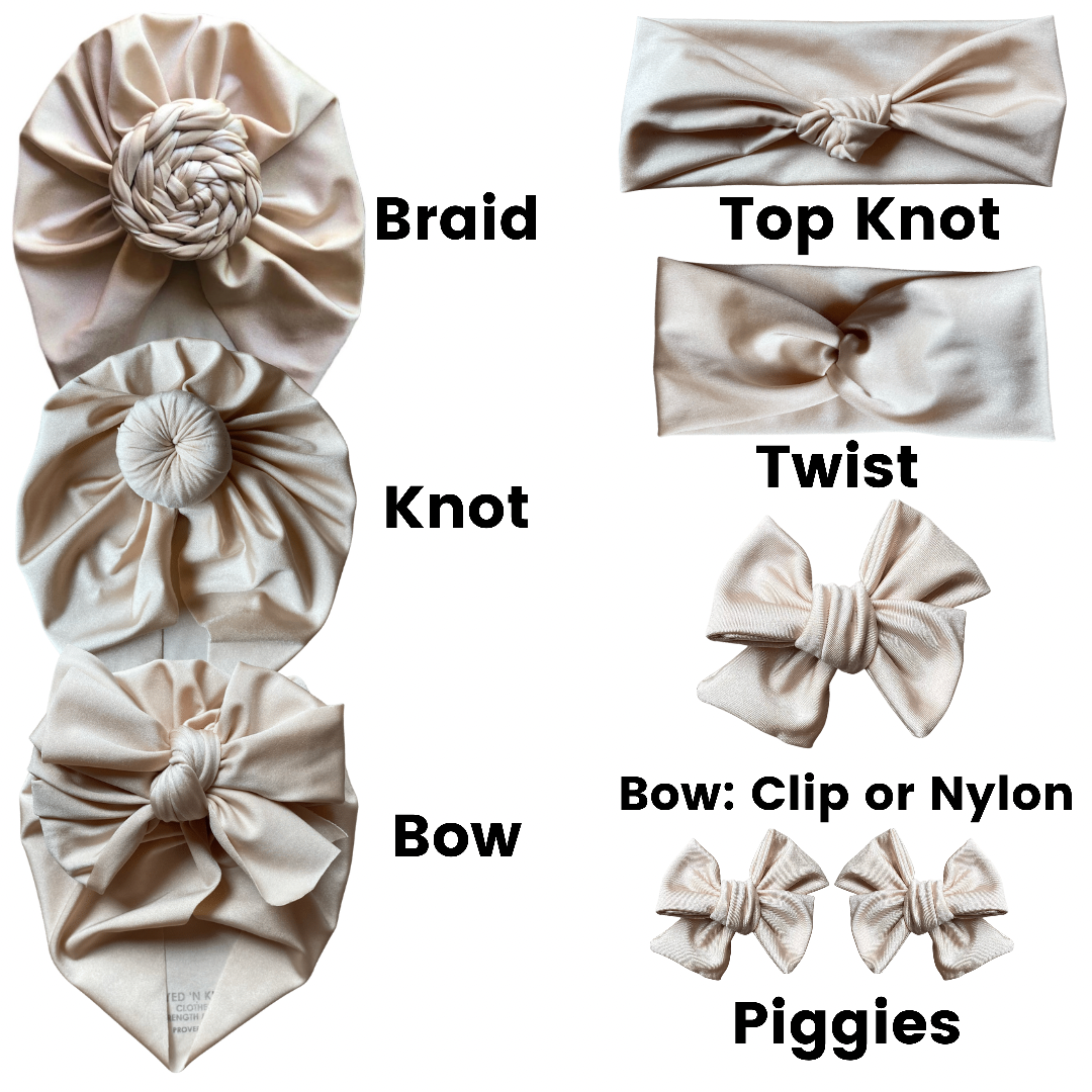 Available in a turban, headband (match your mini!), piggies, or our BRAND NEW bows!