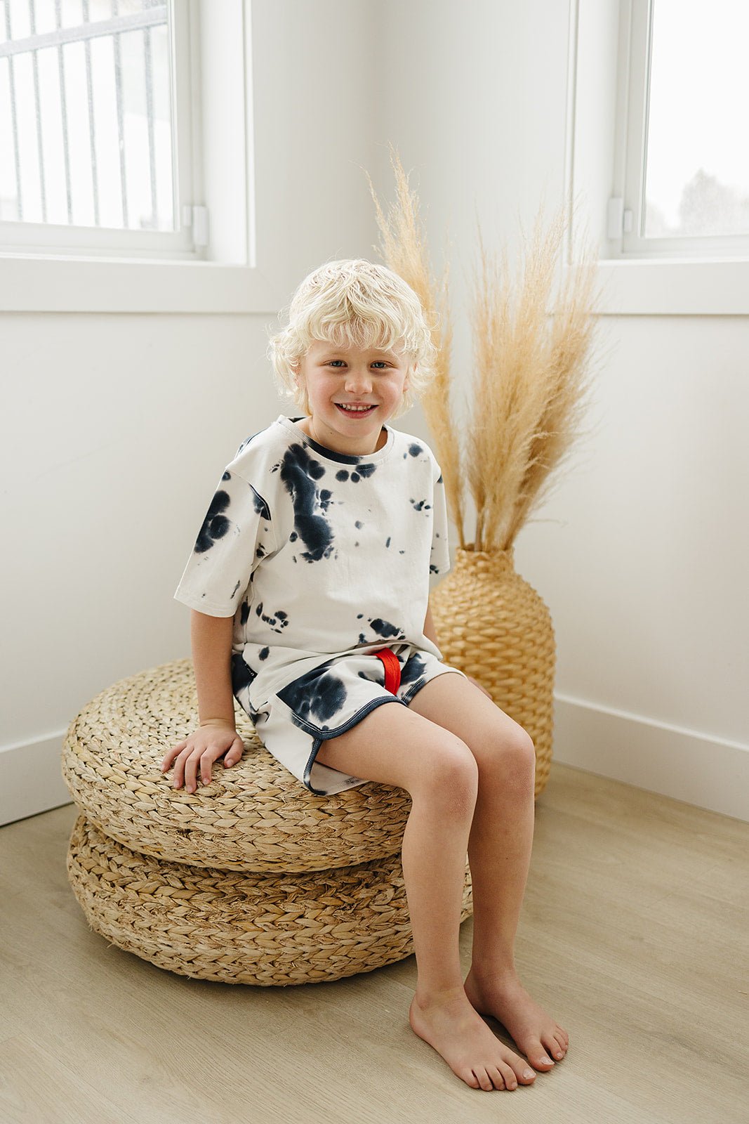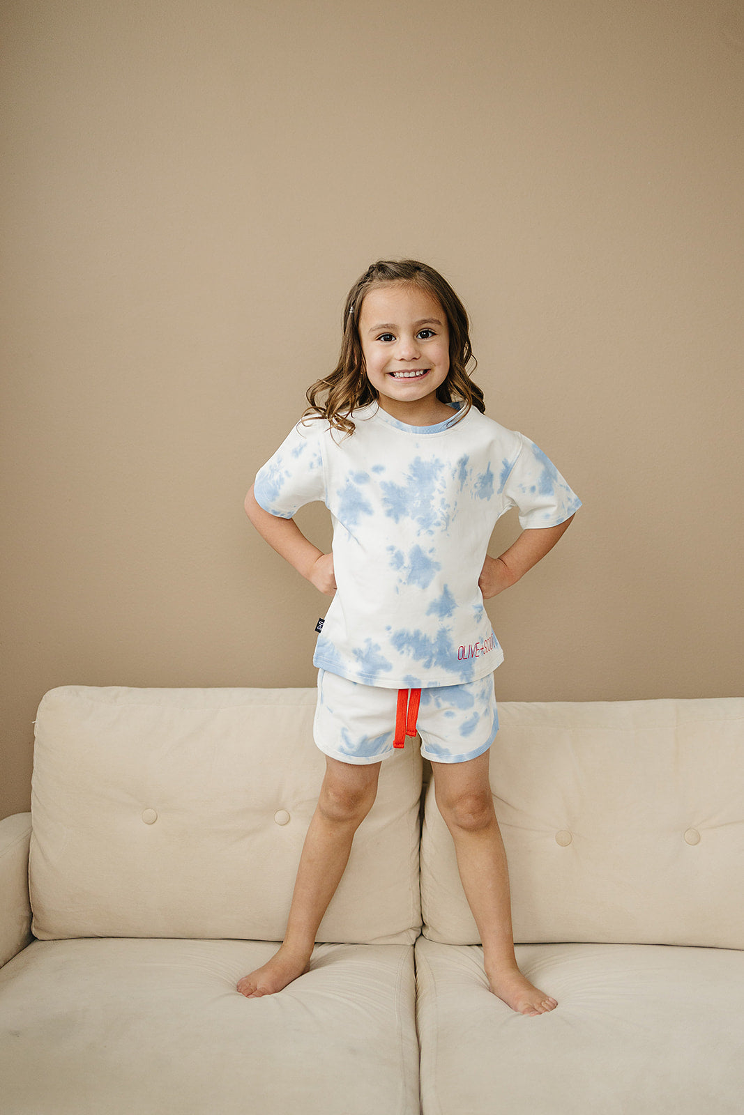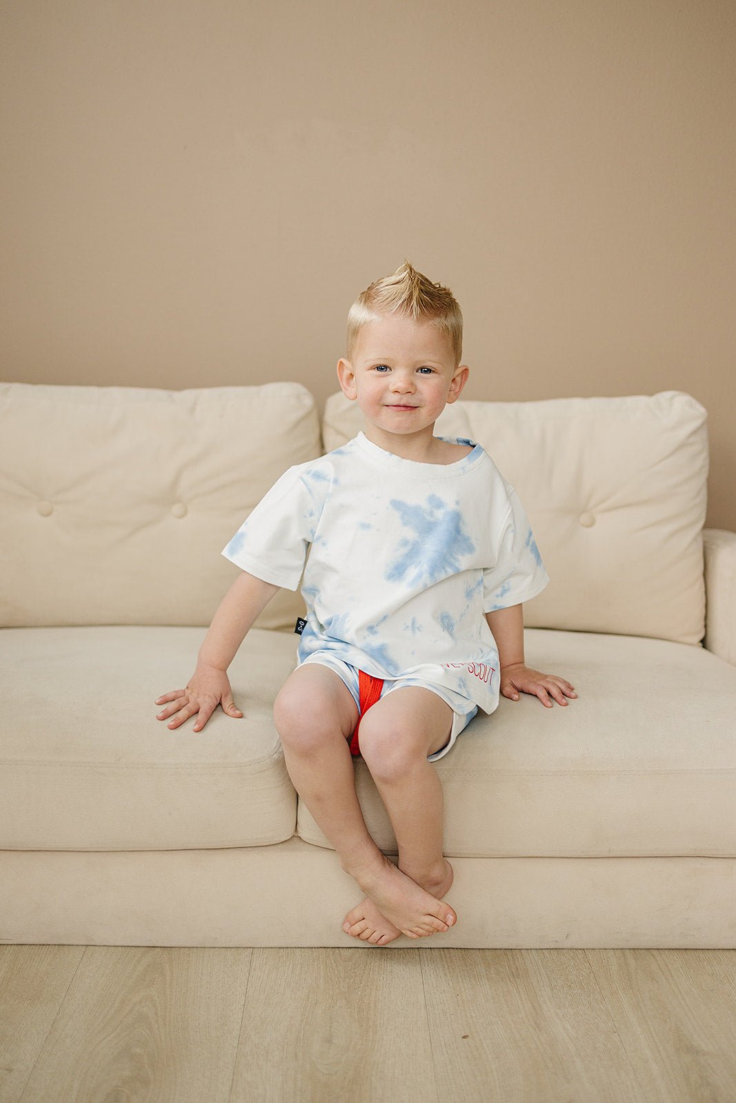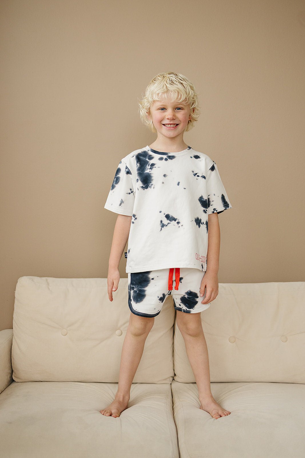 Get your little one ready for their next adventure with the Kai Set. The tie-dye colors and contrasting red print logo add a unique and fun touch while hiding any spills or stains. The elastic waistband and functional drawstring make it easy to wear and play in. Perfect for the young and adventurous!