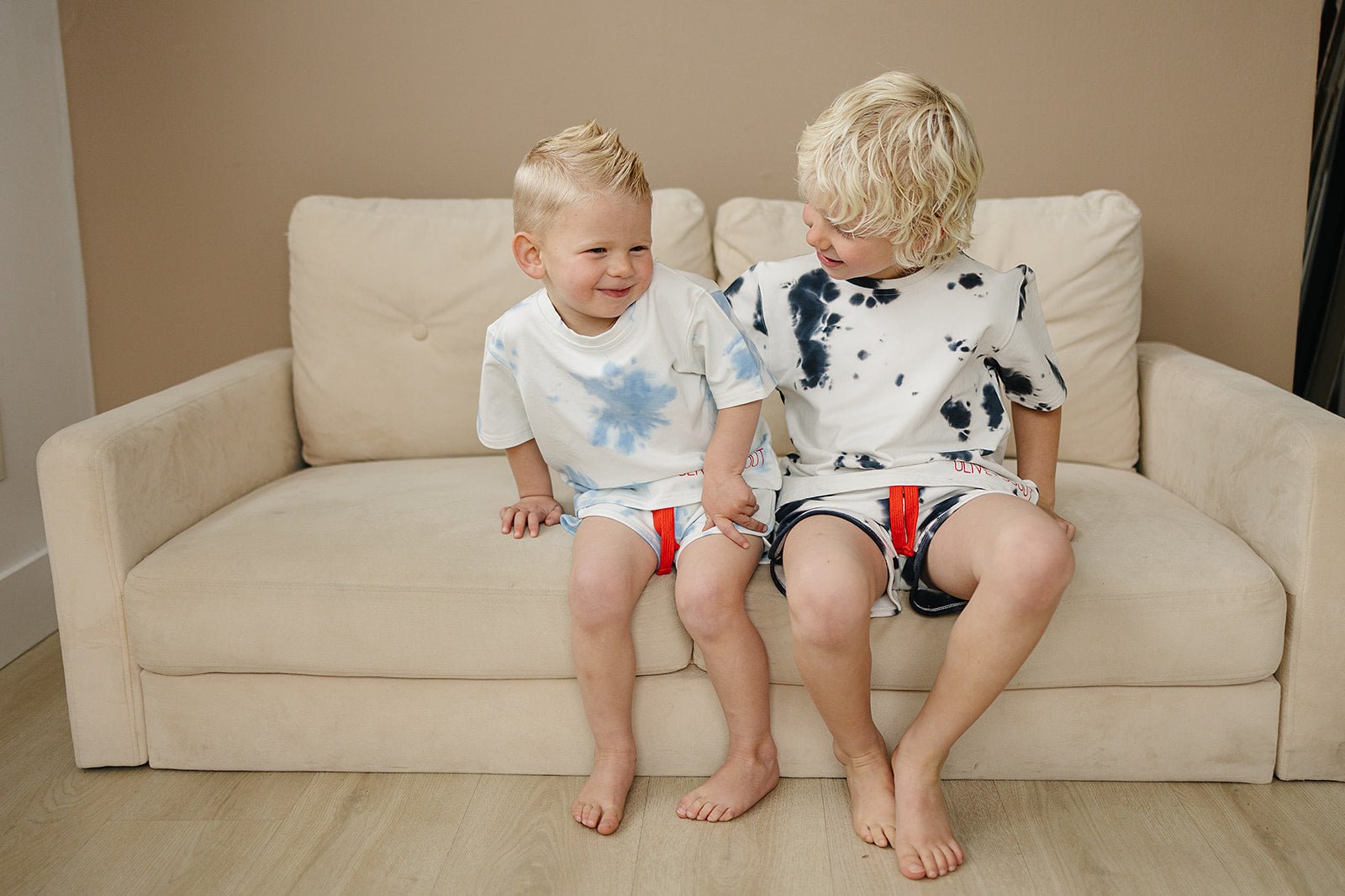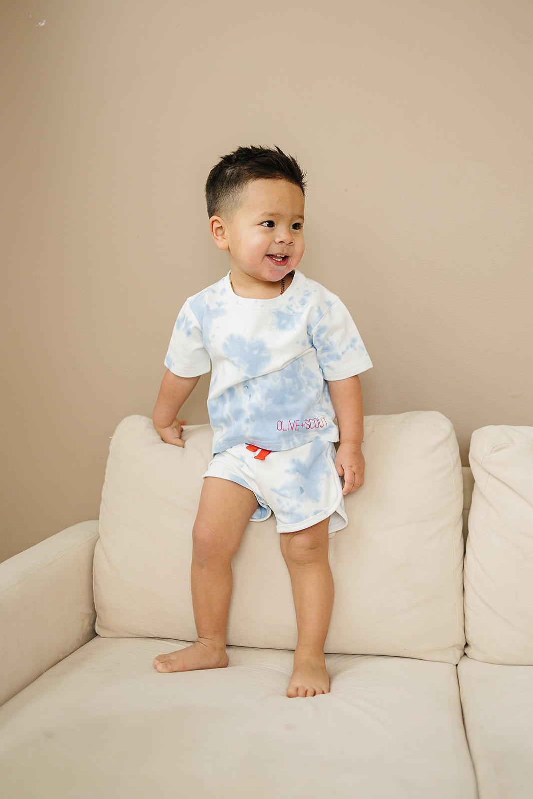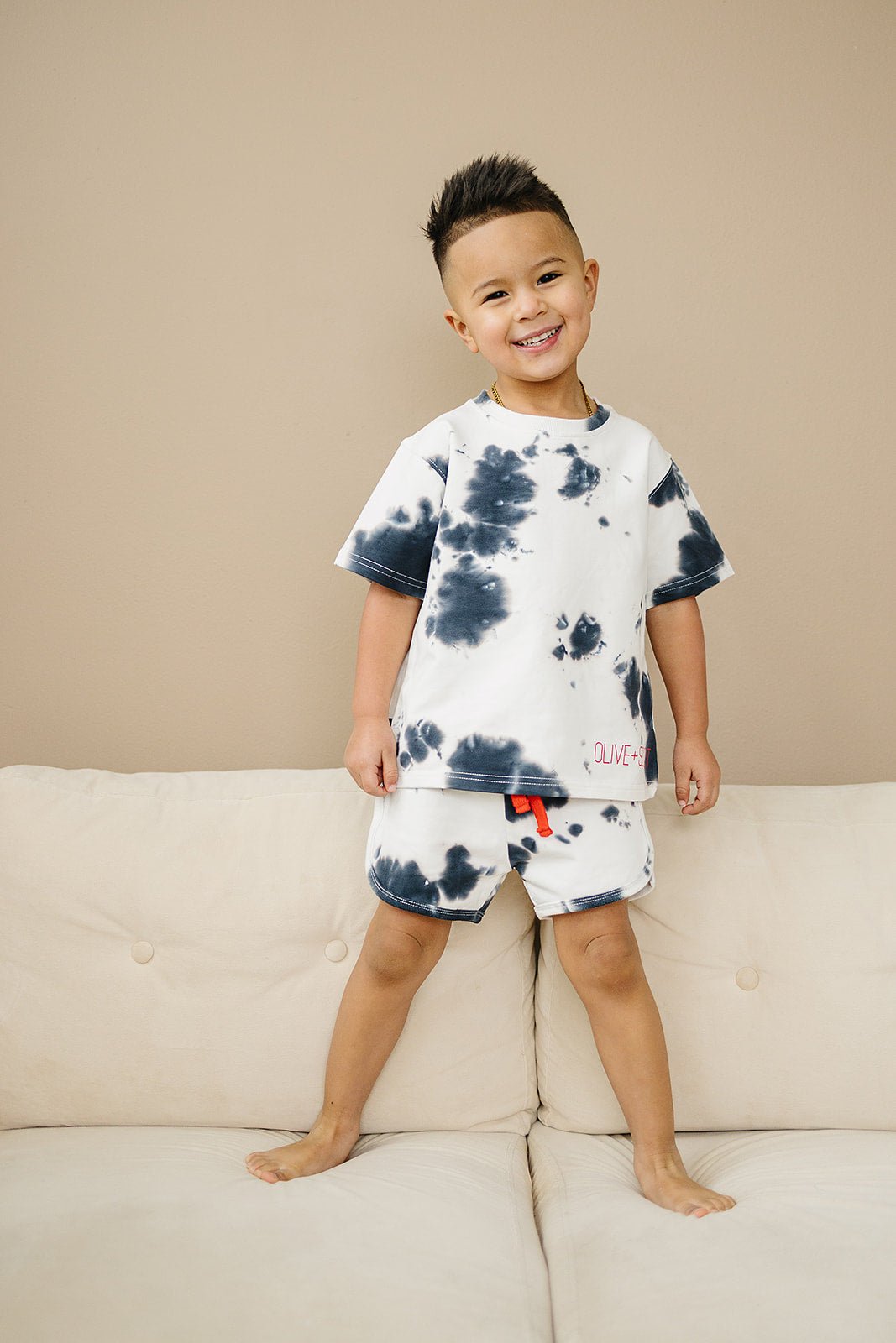 Get your little one ready for their next adventure with the Kai Set. The tie-dye colors and contrasting red print logo add a unique and fun touch while hiding any spills or stains. The elastic waistband and functional drawstring make it easy to wear and play in. Perfect for the young and adventurous!