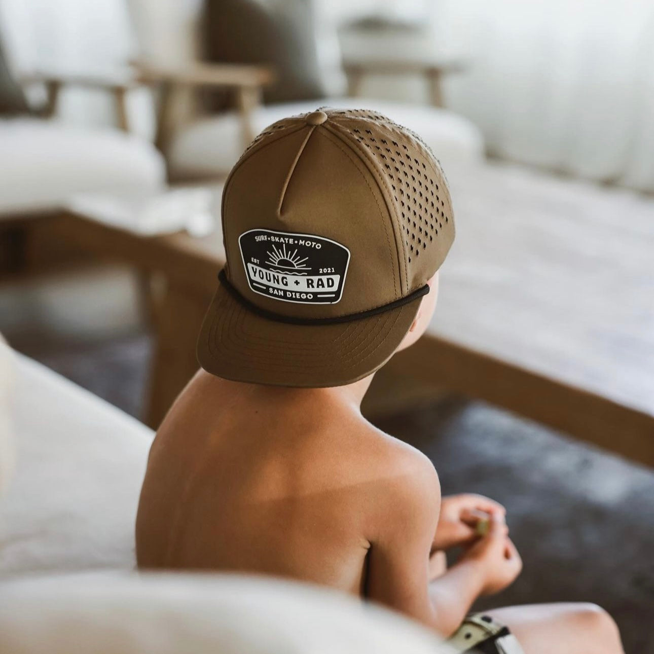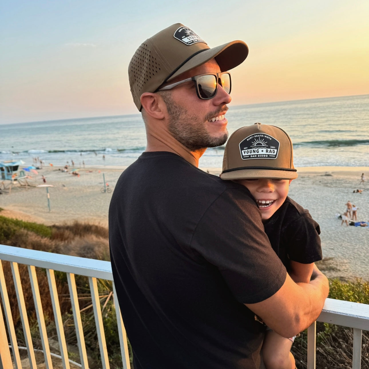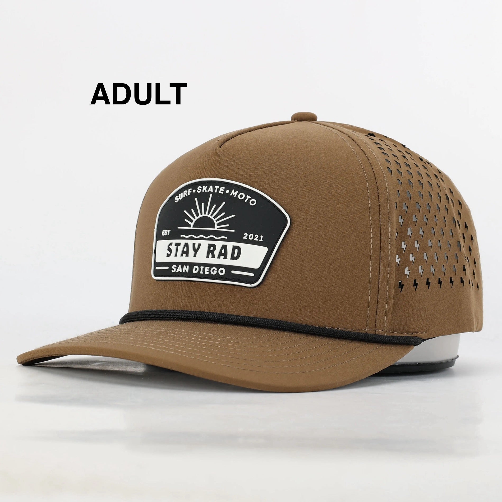 Kids hats say "Young + Rad" and adult hats say "Stay Rad" as shown in photos