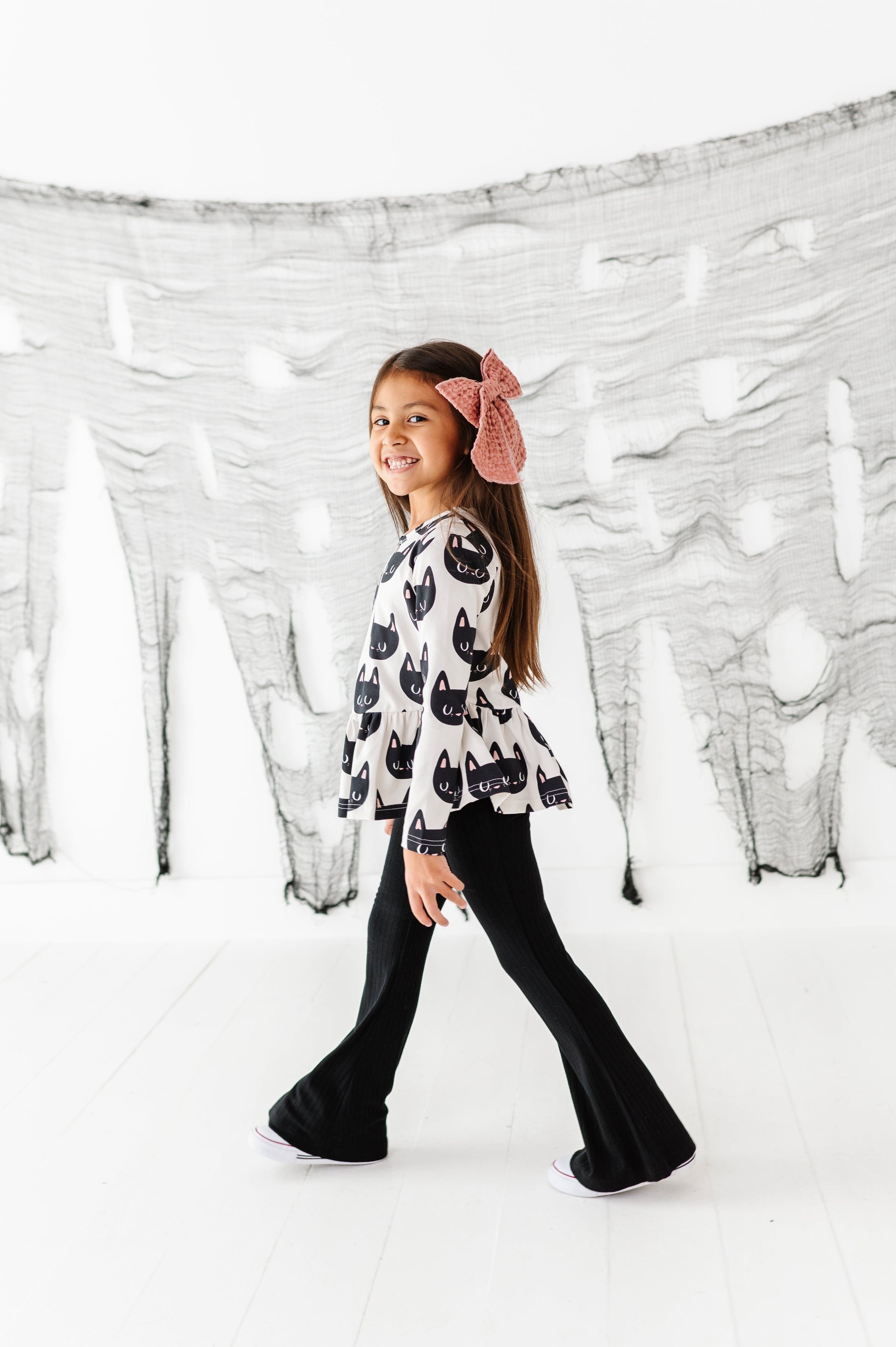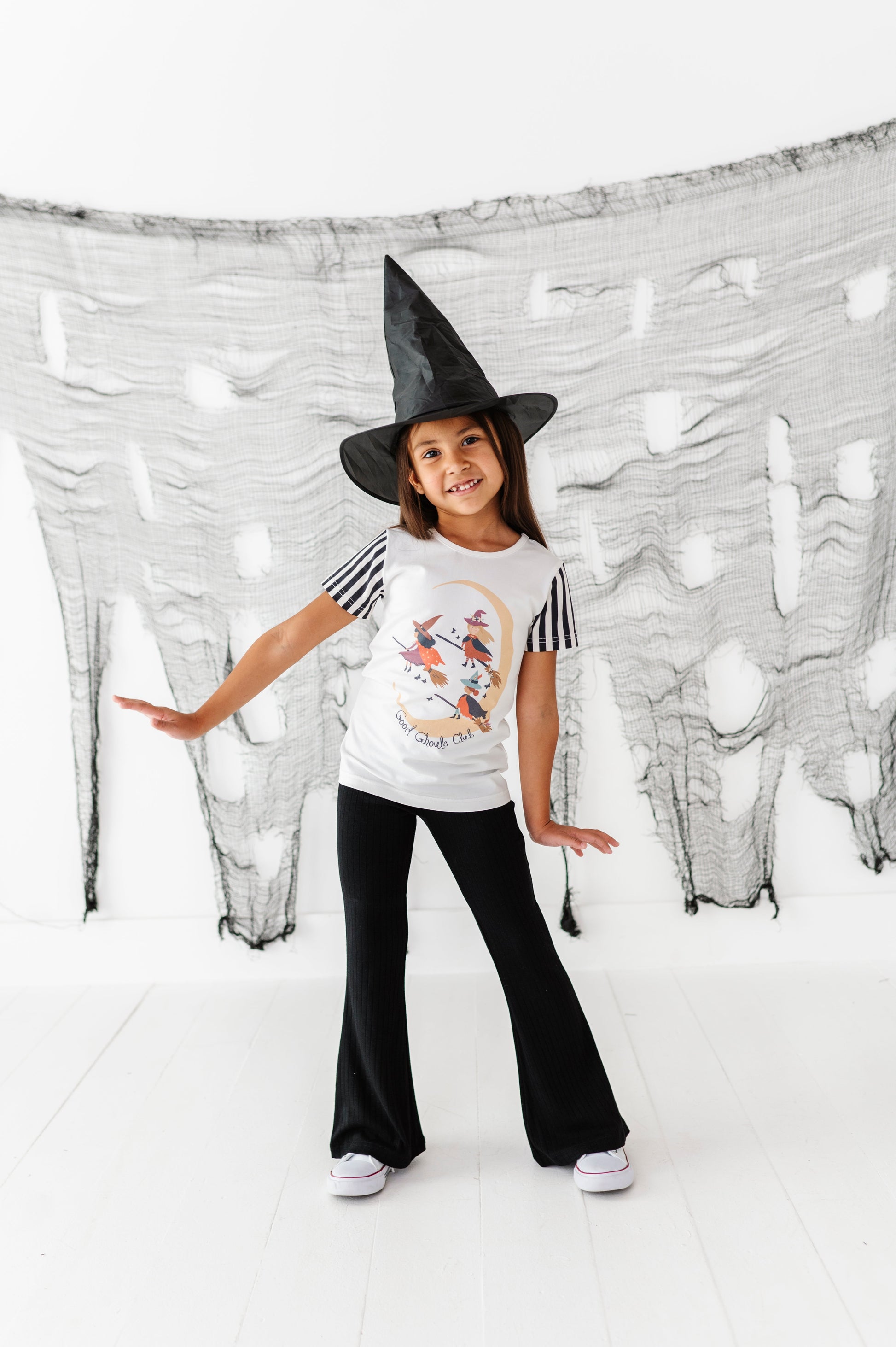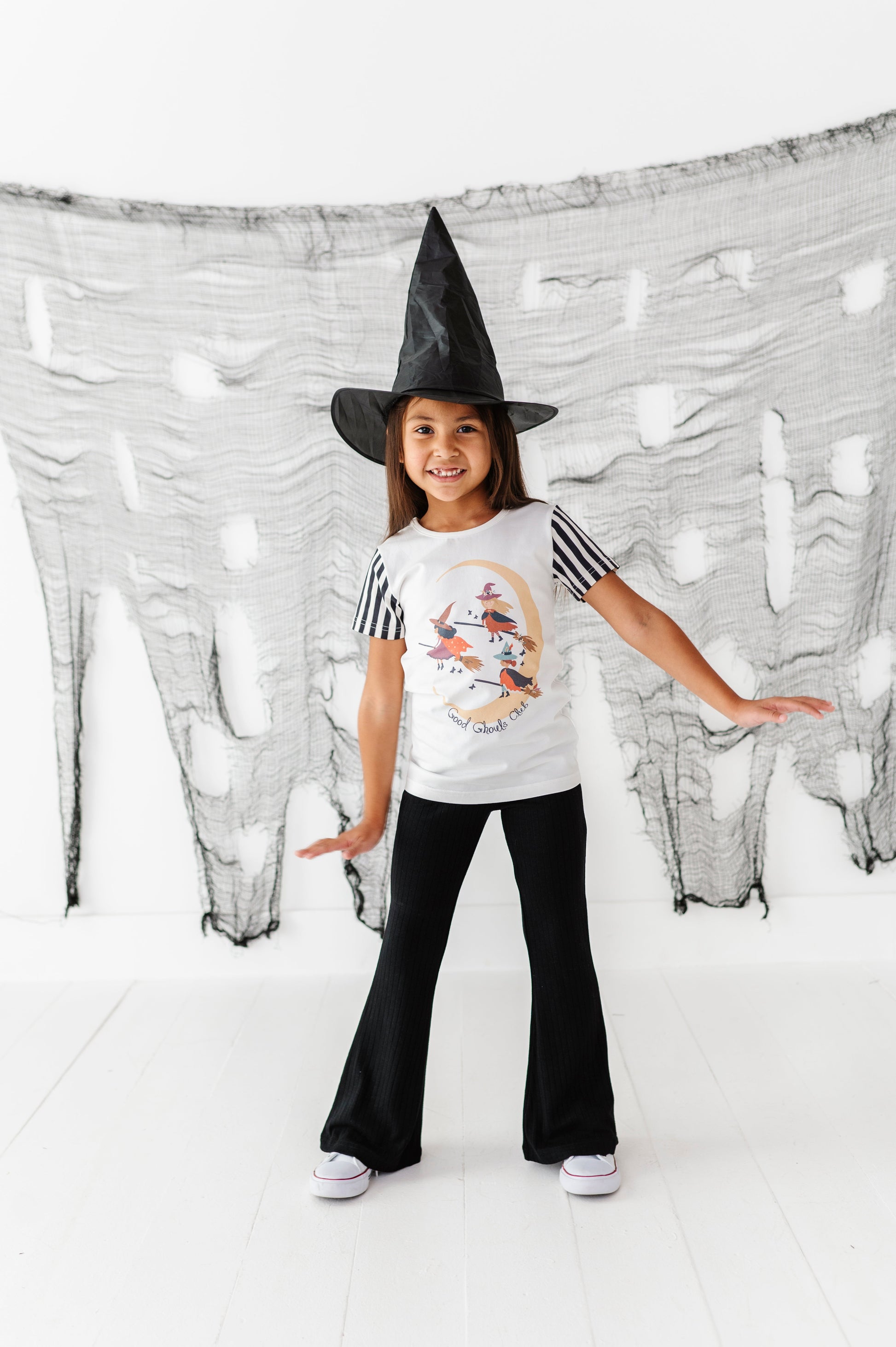 This item runs true to size. These are made to fit snug in the waist/hips and top of legs and then flare at the knee down. If you have a girl with long legs we recommend ordering the size she needs for pant length! If you have a shorter girl we don't recommend sizing up because you don't want flares to drag on the floor :)