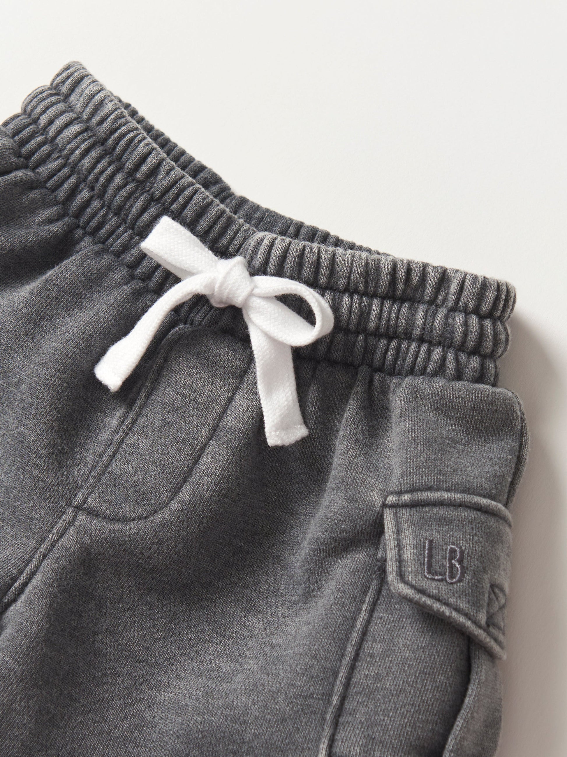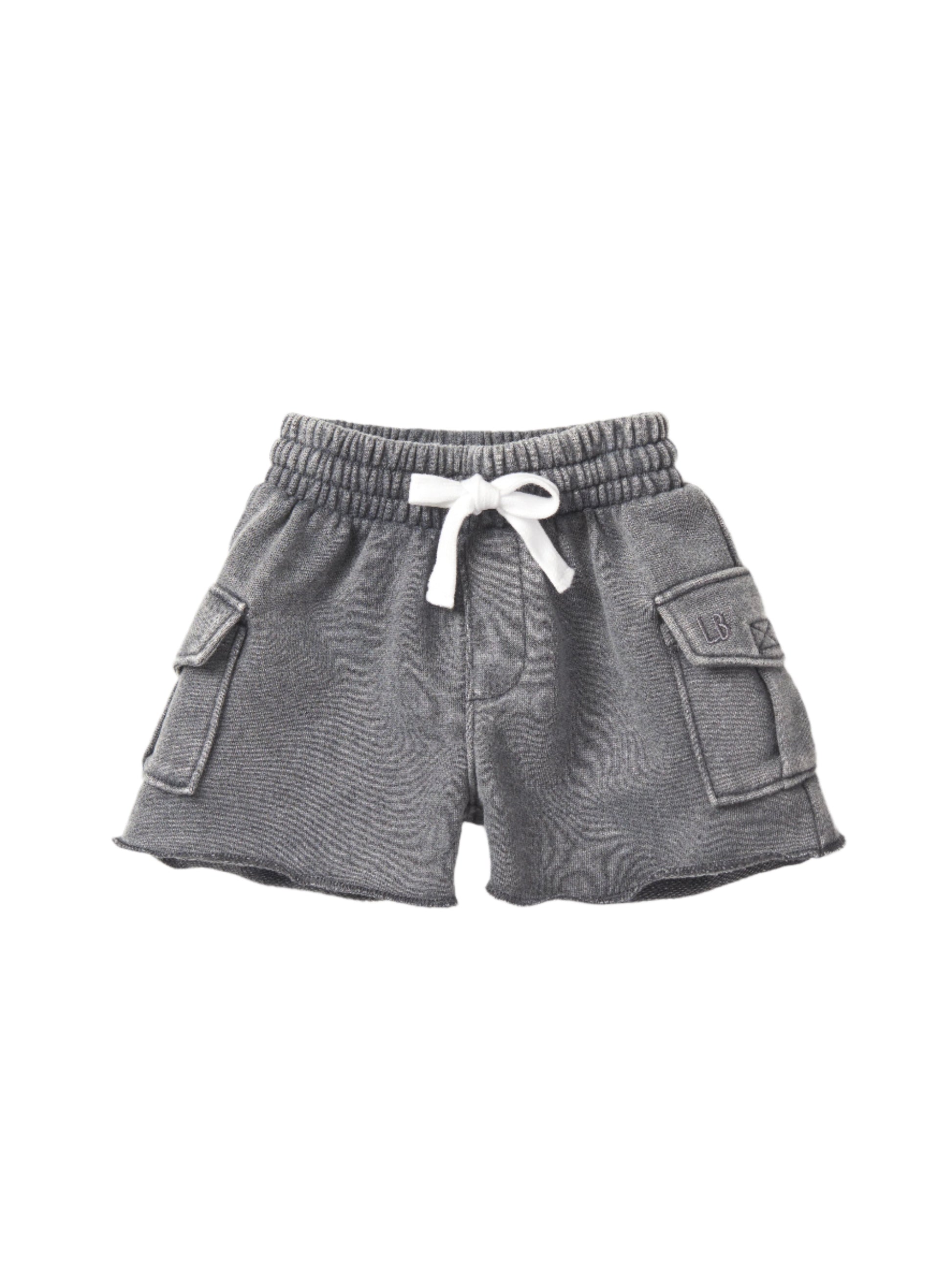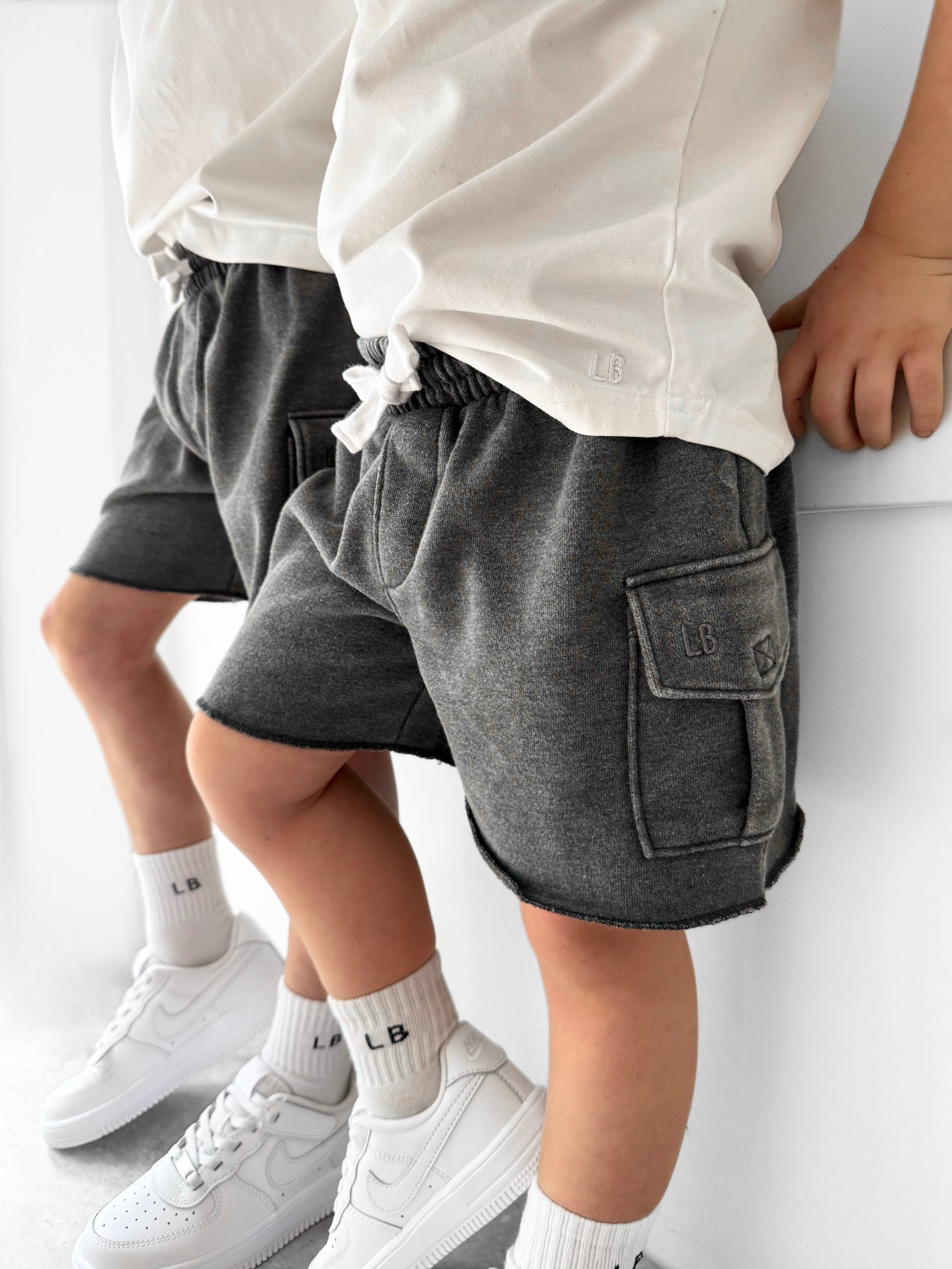 These Raw Edge Cargo Shorts in a Charcoal Wash are the perfect combination of comfort, style, and functionality. Crafted with a ribbed elastic waistband and a functional sewn-in drawstring, these shorts provide a secure and adjustable fit for active kids. The two side cargo pockets offer plenty of storage space for small essentials, while the fixed raw edge bottom hem adds a trendy, laid-back look. Perfect for casual days, outdoor play, or relaxed weekends, these shorts are a must-have for every little wardrobe.