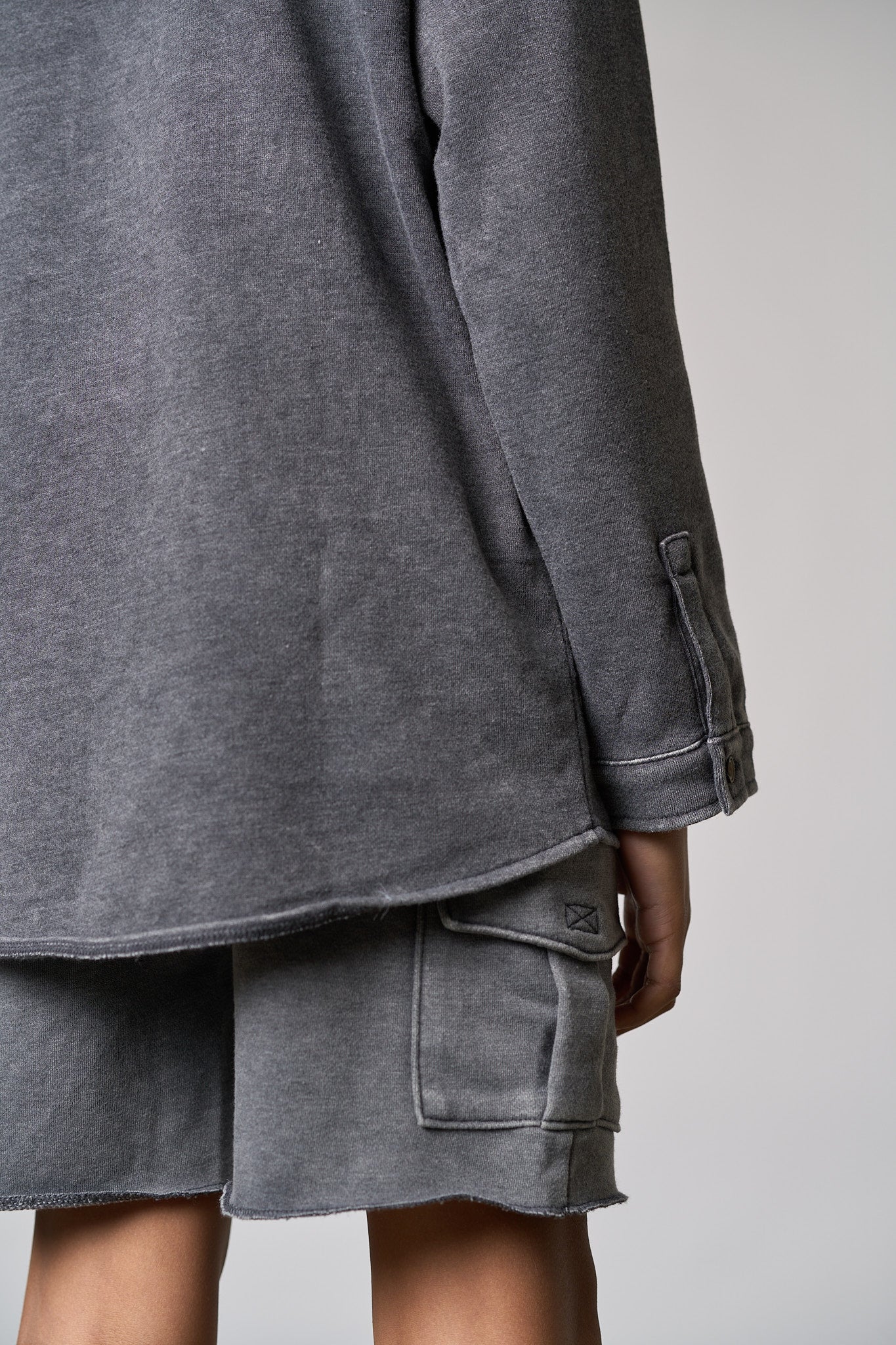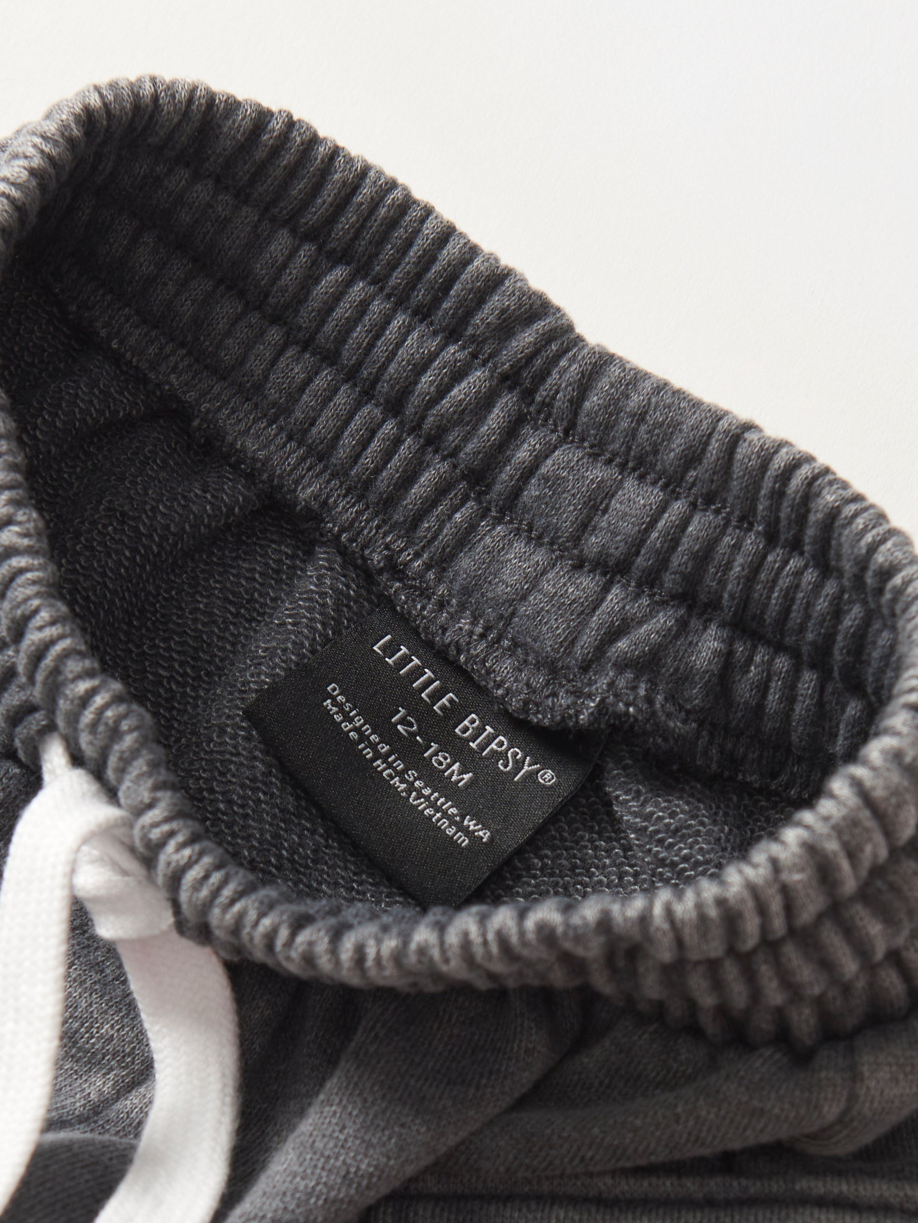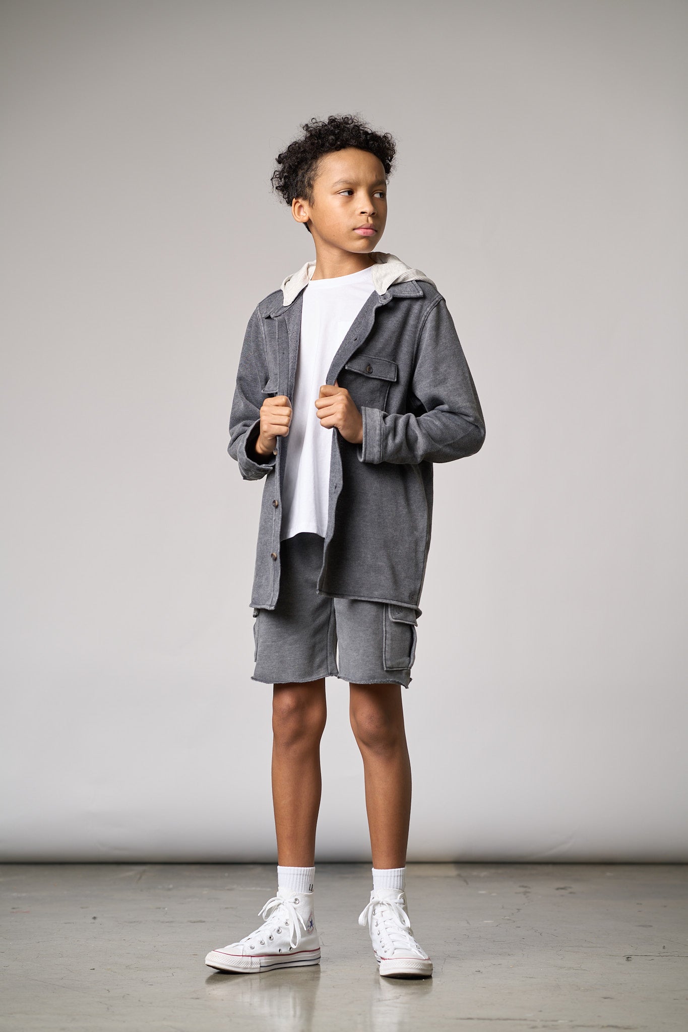 These Raw Edge Cargo Shorts in a Charcoal Wash are the perfect combination of comfort, style, and functionality. Crafted with a ribbed elastic waistband and a functional sewn-in drawstring, these shorts provide a secure and adjustable fit for active kids. The two side cargo pockets offer plenty of storage space for small essentials, while the fixed raw edge bottom hem adds a trendy, laid-back look. Perfect for casual days, outdoor play, or relaxed weekends, these shorts are a must-have for every little wardrobe.