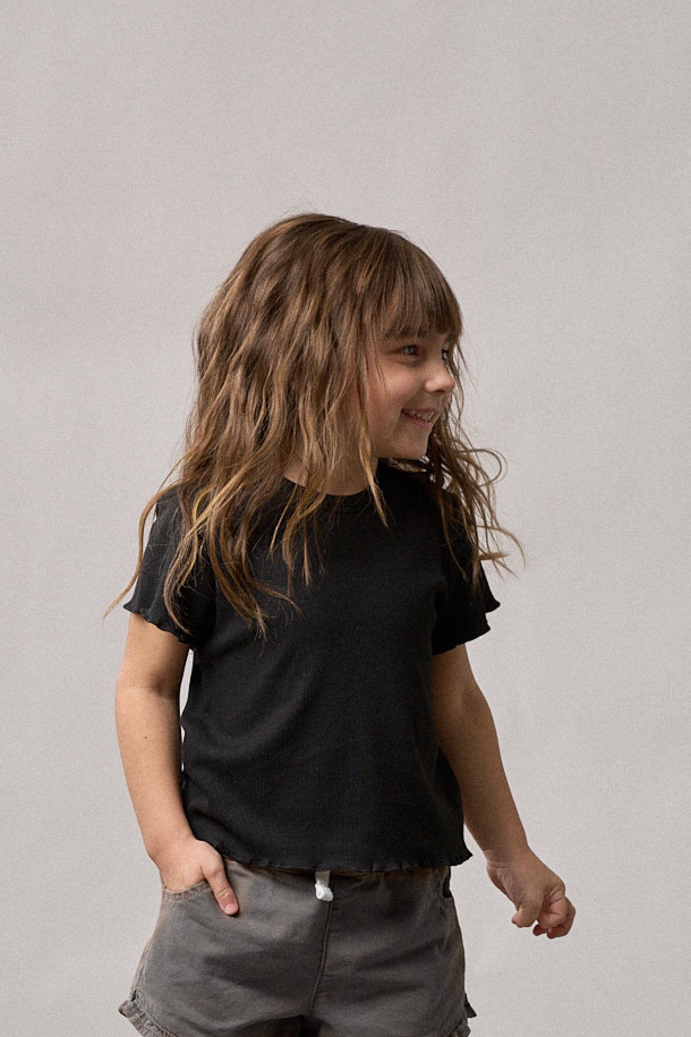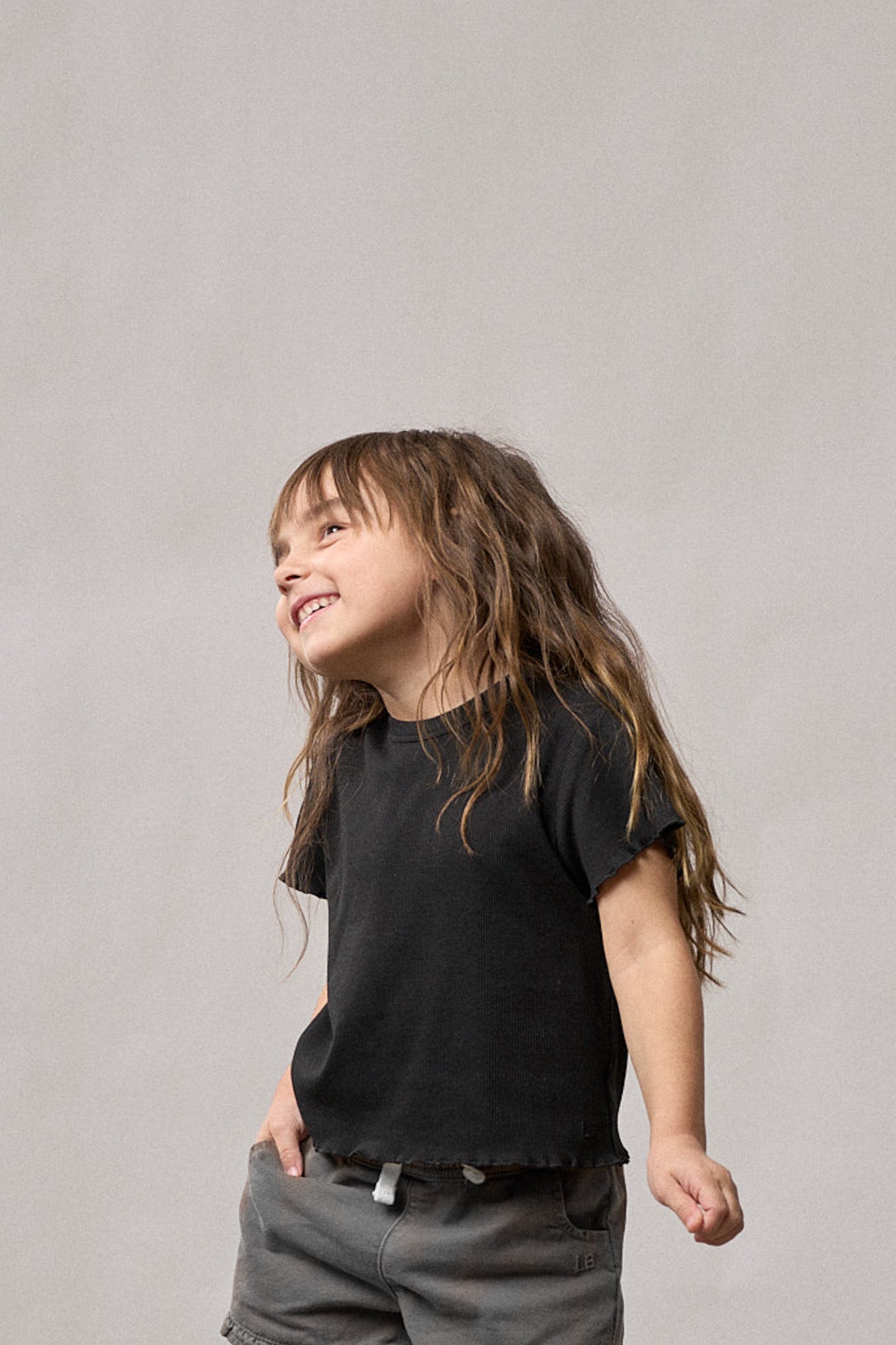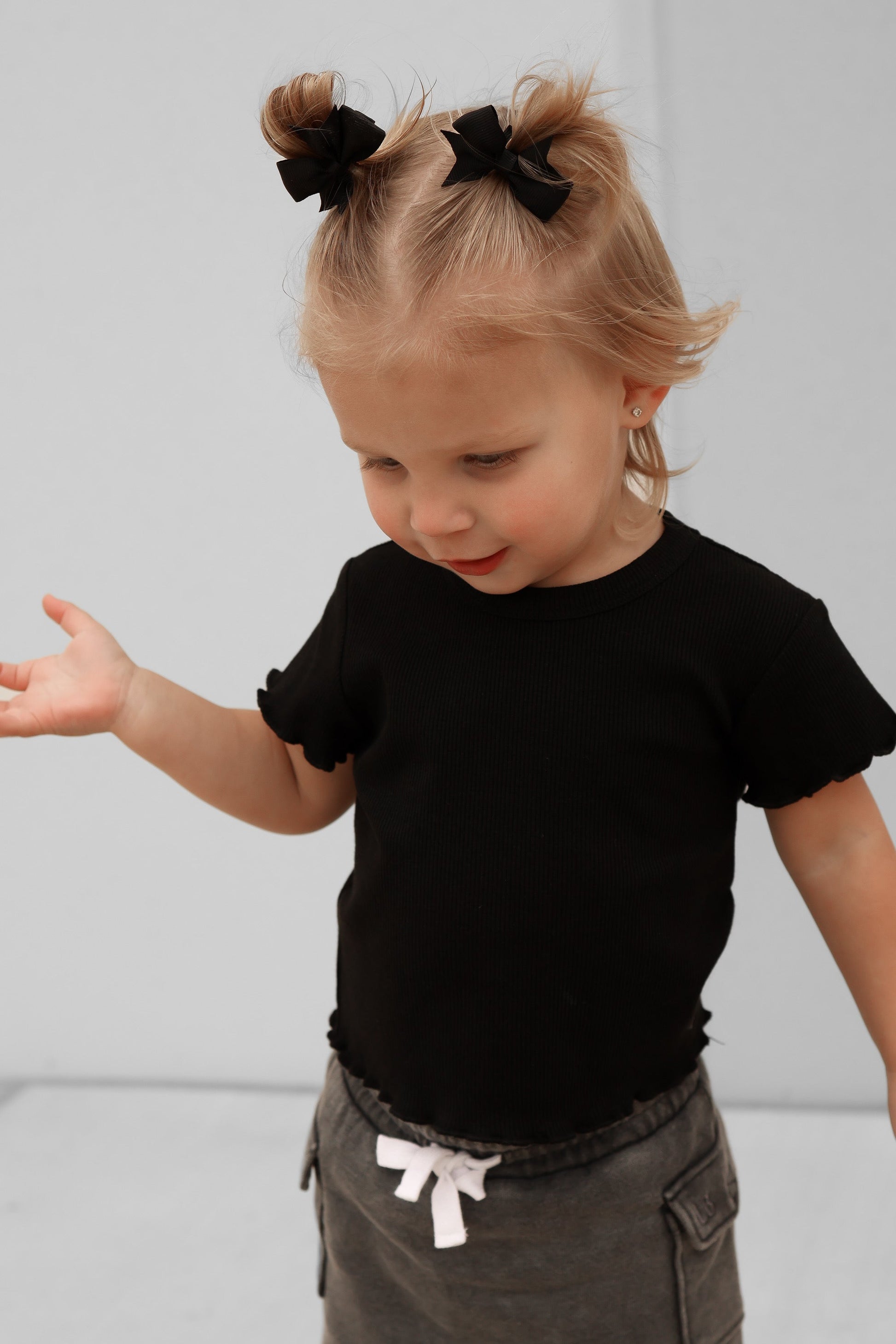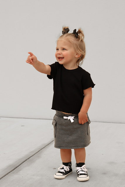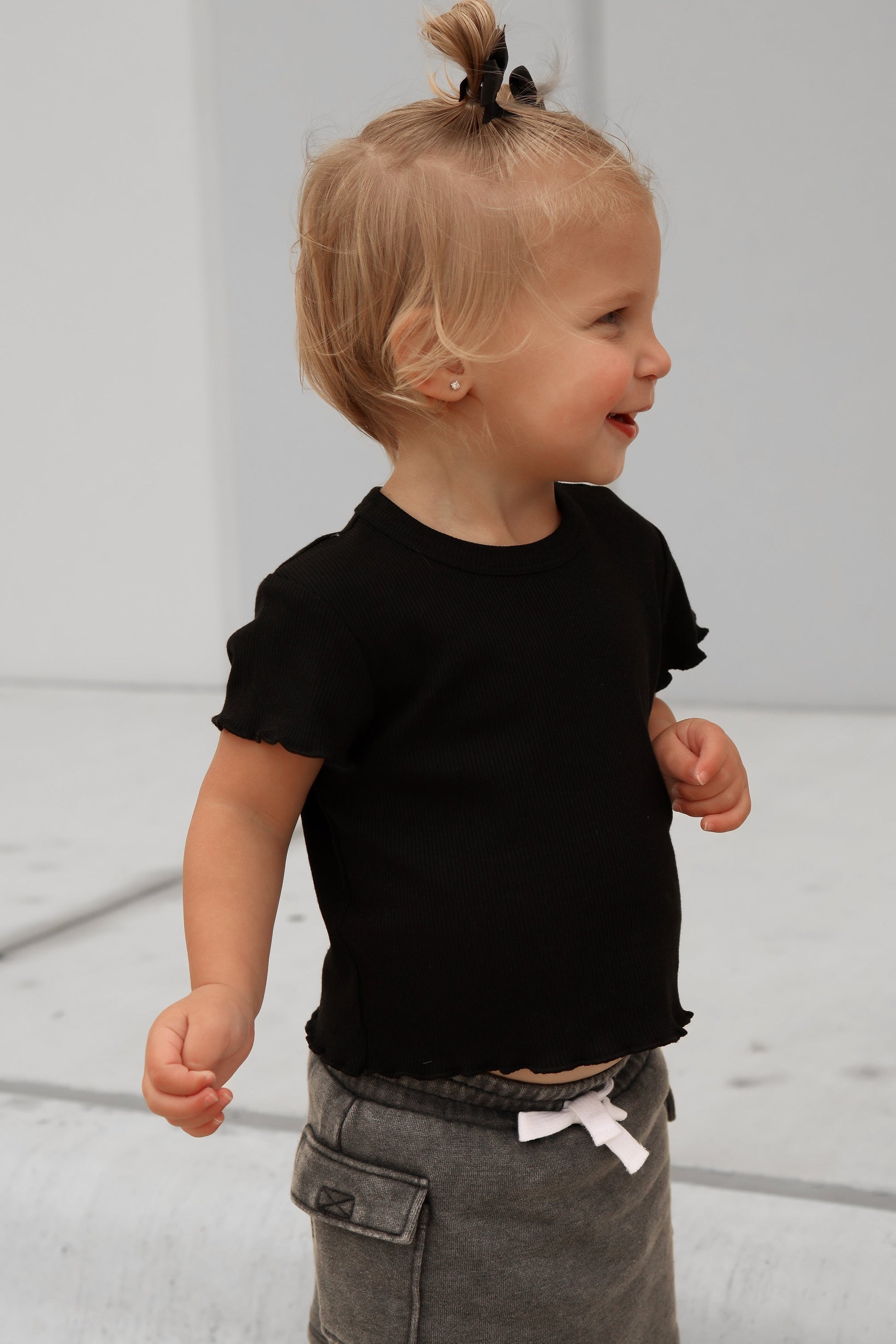 Sleek, stylish, and full of personality, our Black Lettuce Trim Tee is the perfect addition to any little girl’s wardrobe. This classic black tee features playful lettuce trim detailing on the sleeves and bottom hem, adding a fun twist to an everyday essential. With its comfy crewneck design and relaxed fit, it’s ideal for both school days and casual weekends.
