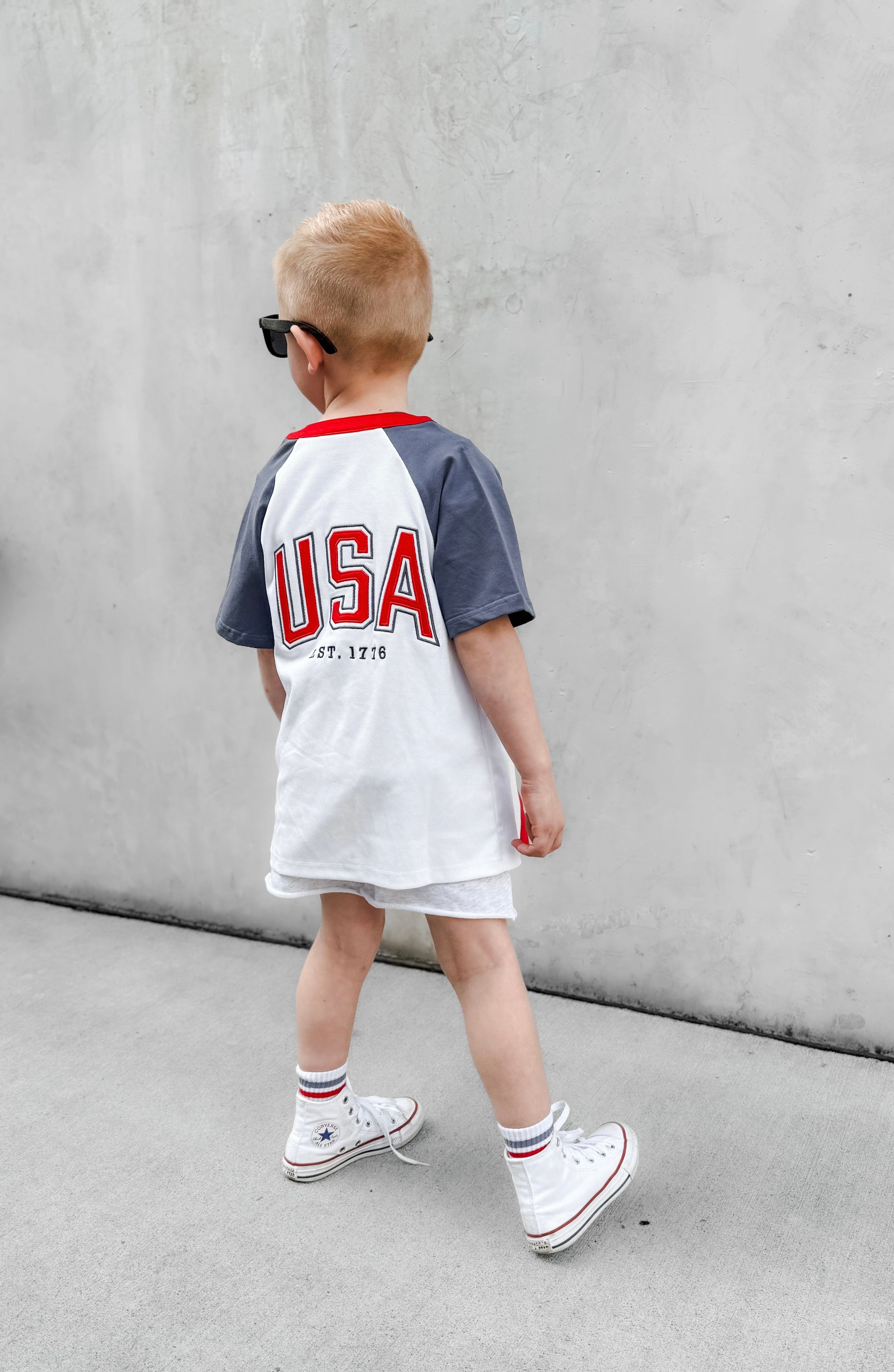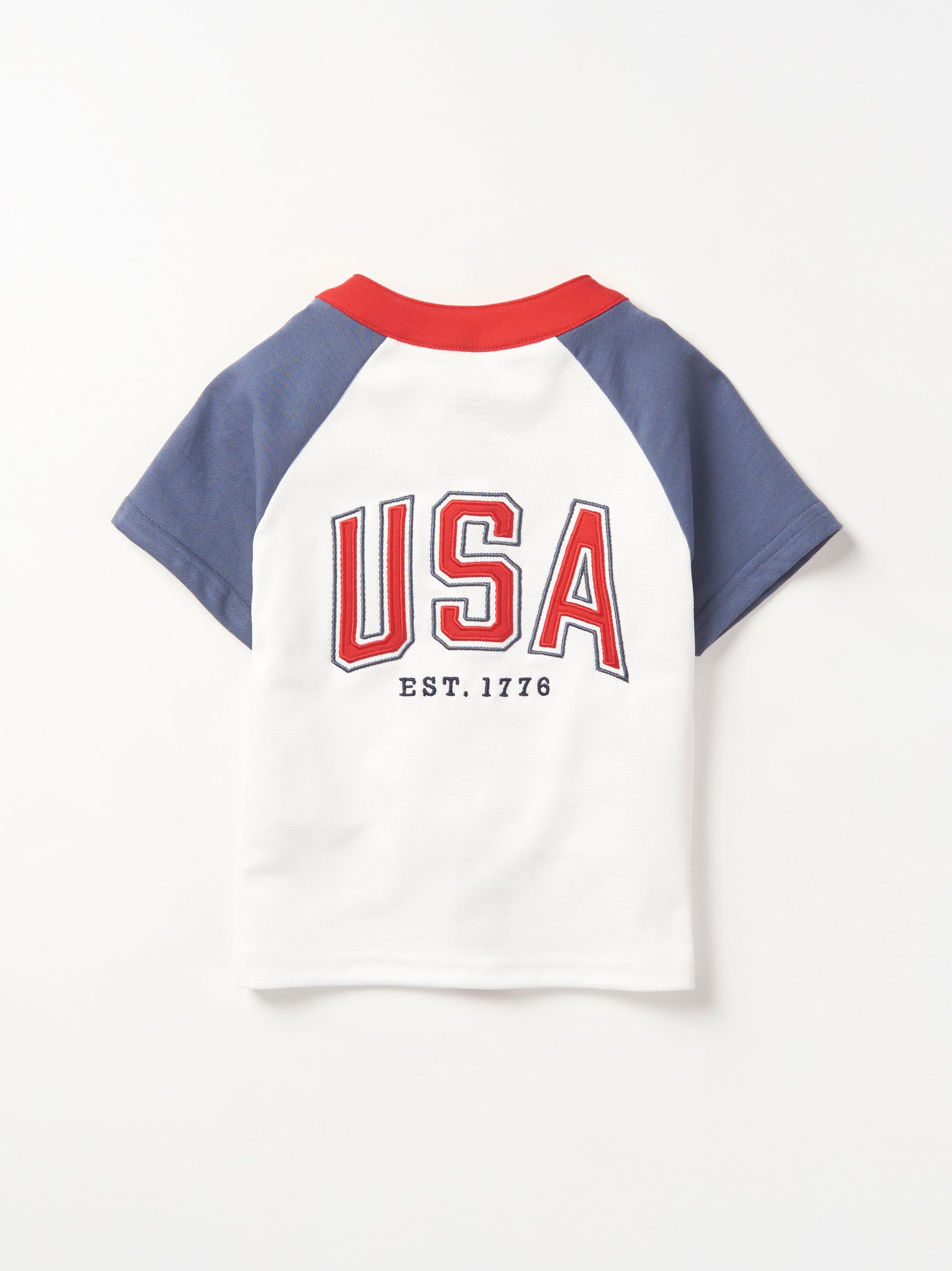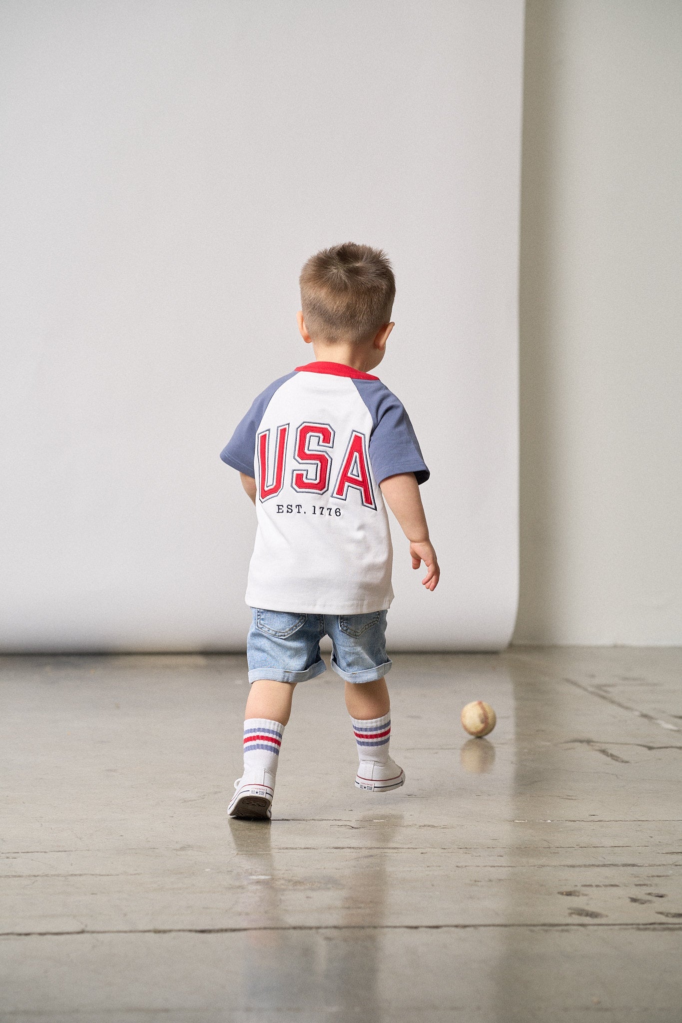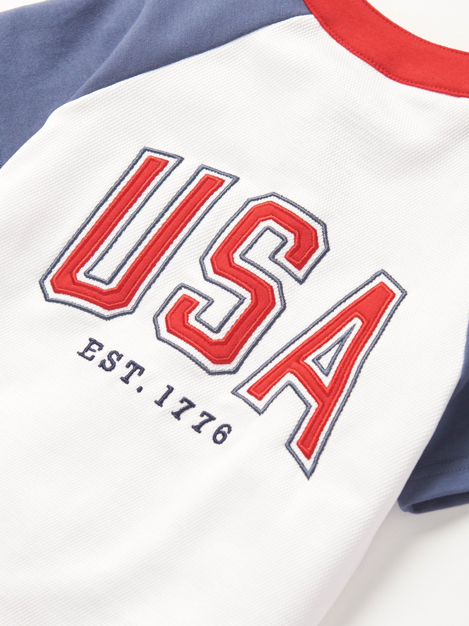 Rep the USA in style! This white jersey with red and blue accents features an embroidered "USA" on the back and a cool “American Dream” tag. This jersey is a perfect piece to elevate your outfit for any celebration or a day at the fields.