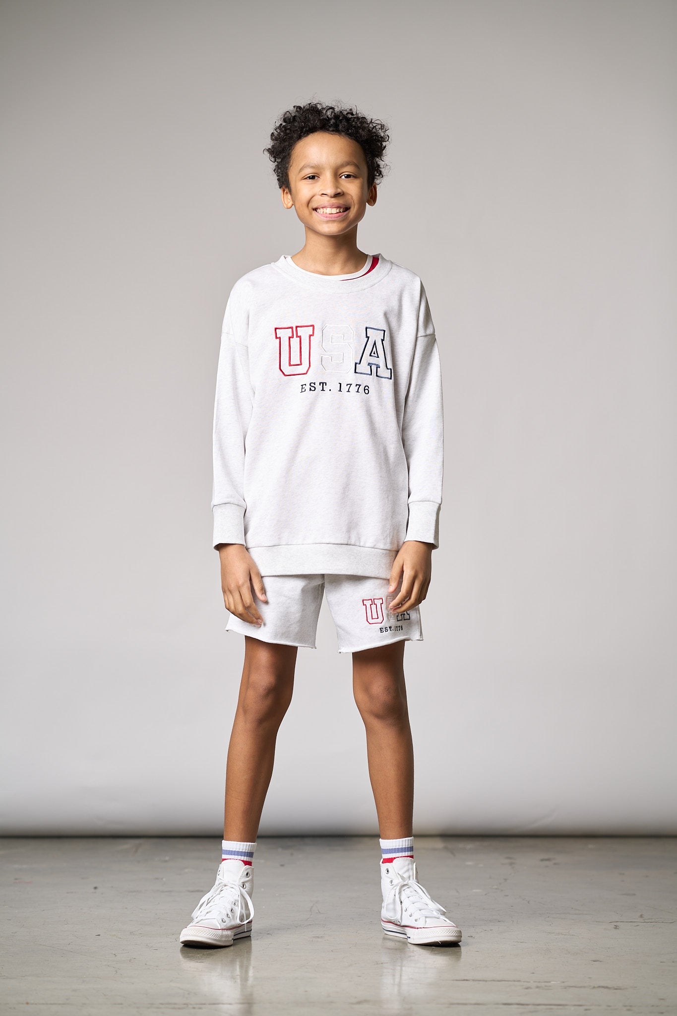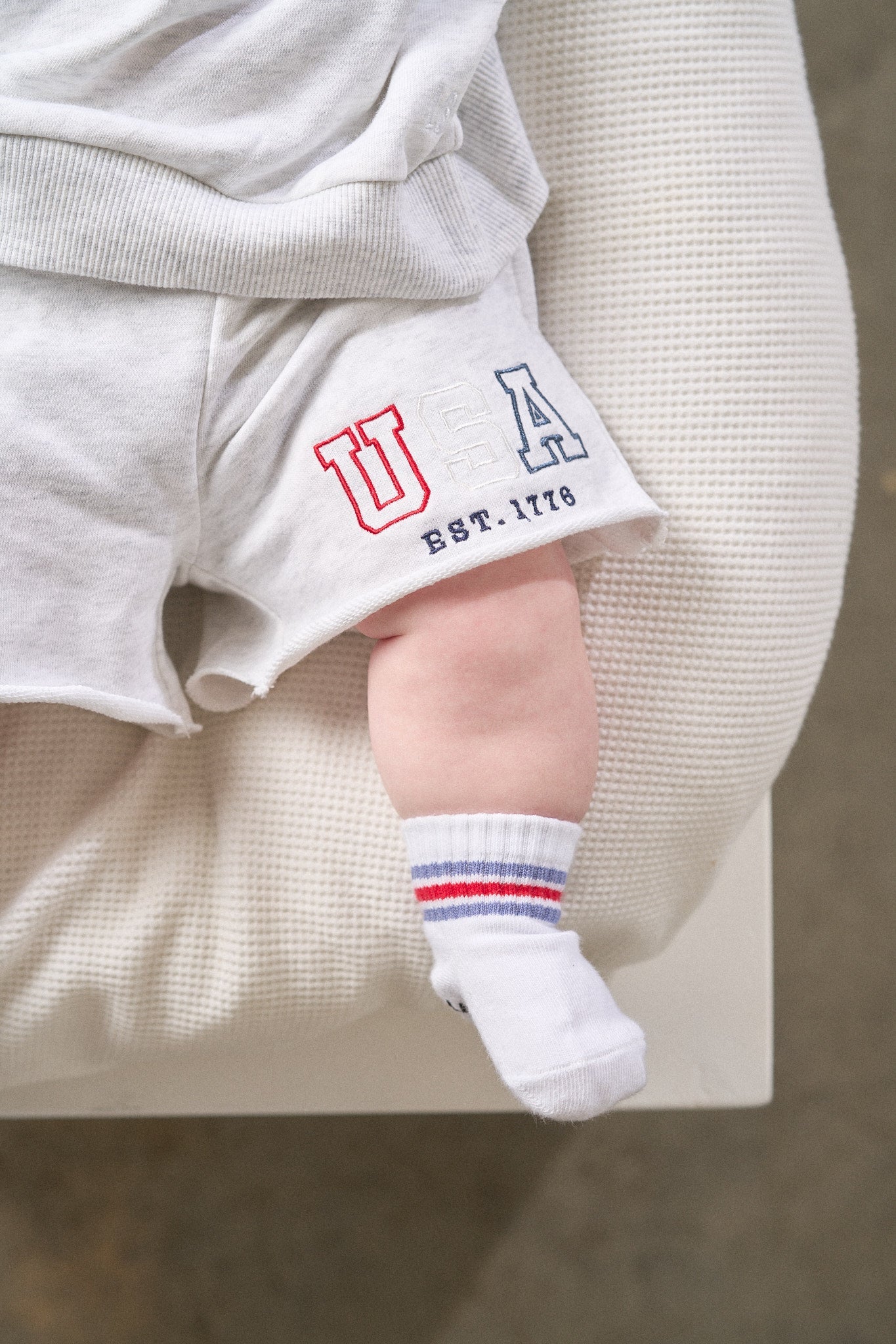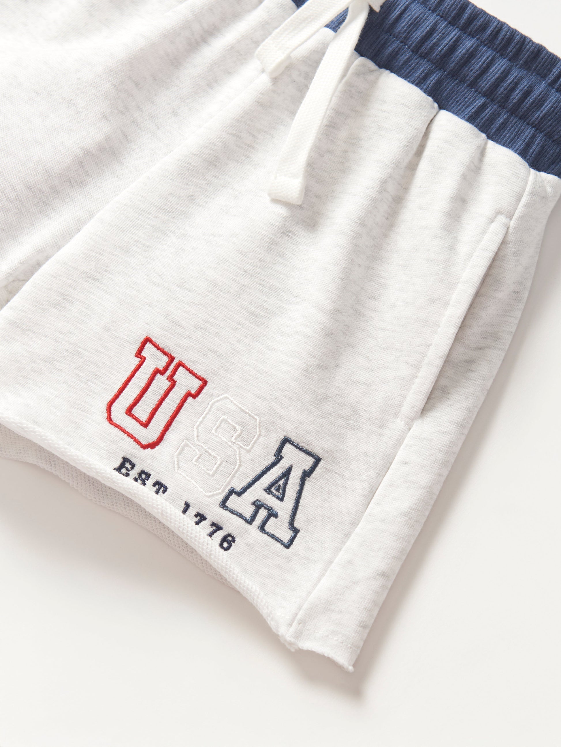 Stay comfy and stylish in these heather grey sweat shorts with a cool navy waistband! Featuring a rollable elastic waistband and a functional drawstring for the perfect fit, these shorts are all about comfort. With two front pockets, one back pocket, and an embroidered "USA" design, they're ready for any laid-back, patriotic day.