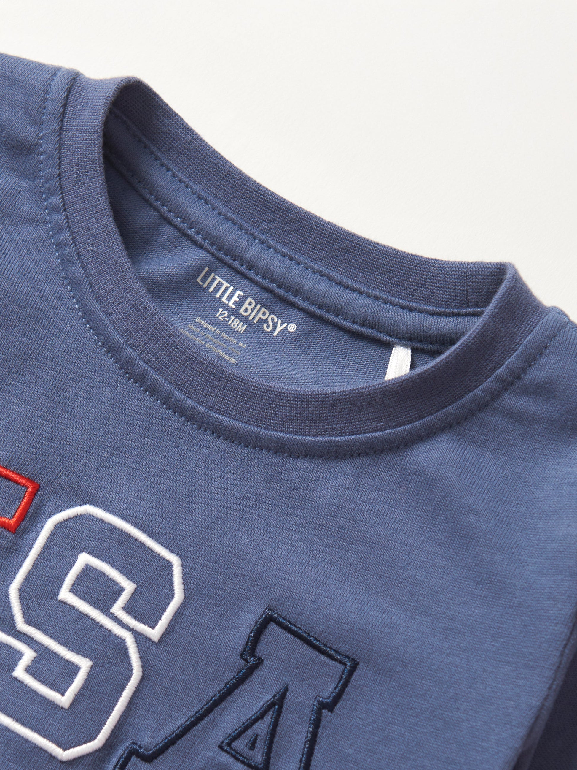 Show off your USA spirit any day of the year in this navy tee! The Cotton/Poly blend fabric is scrumptiously soft and features like an embroidered “USA” on the front and a cool rounded high/low bottom hem, this tee is all about effortless style. Perfect for any casual, patriotic look!